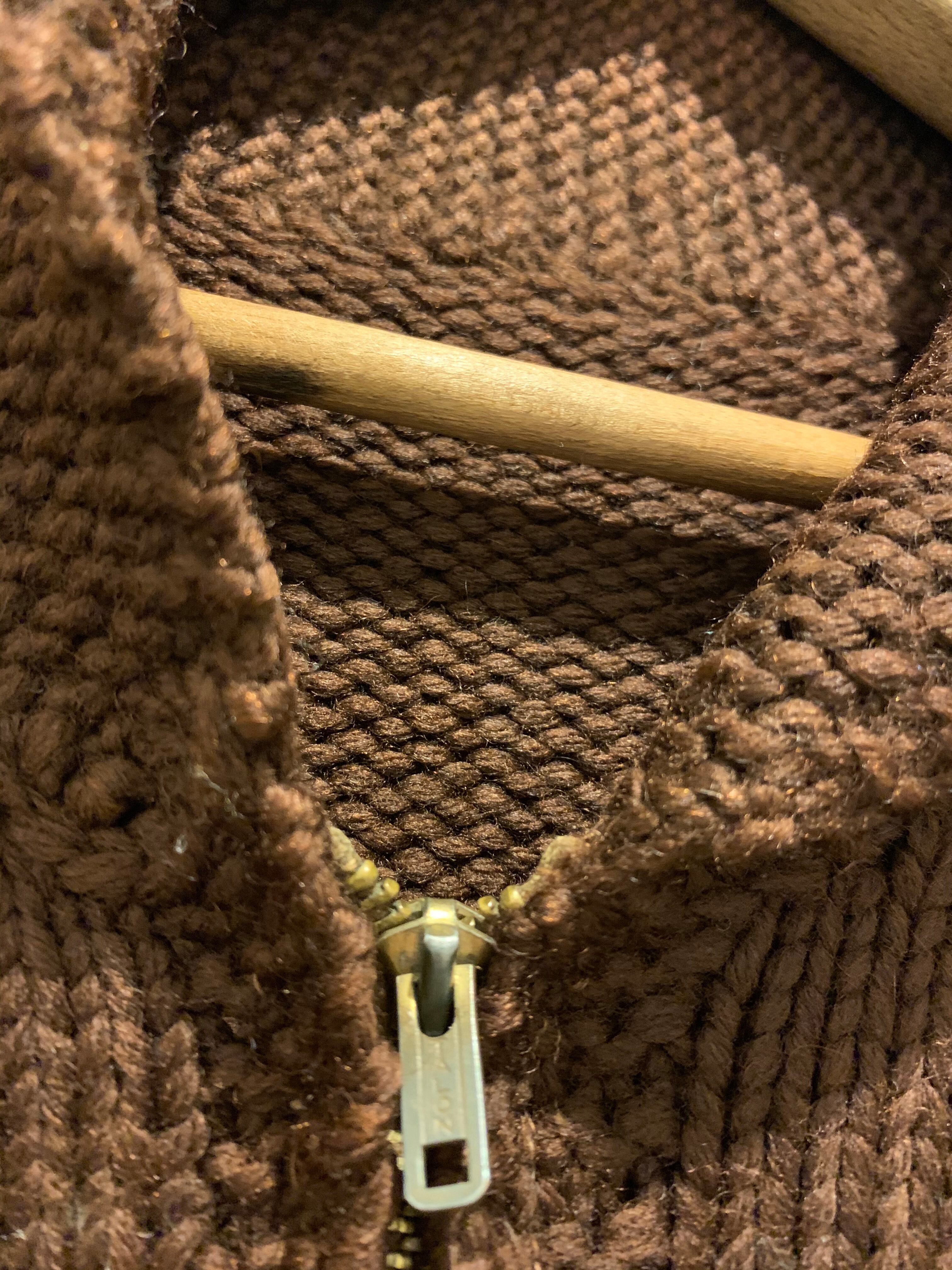 60年代ビンテージのカウチンセーターです。カラーはブラウンベースでアクセントにグリーンが入り良いカラーリングとなります。ショールカラーでブラスのTALONジッパーを使用しています。裾にポケットが付き、ニットの目も詰まっていて触った感じの生地感もビンテージカウチンの雰囲気が漂っています。サイズ表記はございませんが小柄な男性か女性の方にオススメなサイズ感となります。