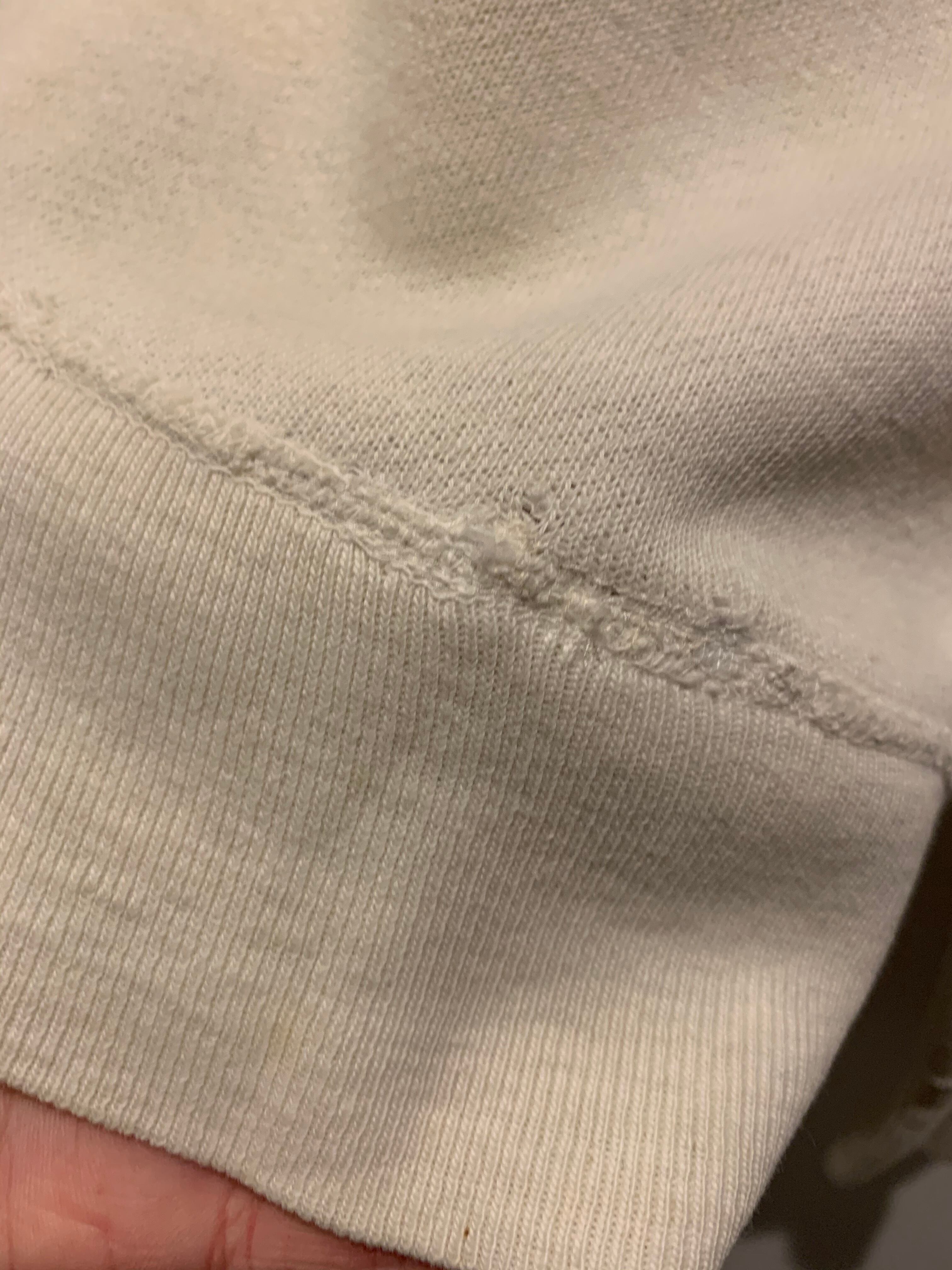 50年代〜60年代のビンテージスウェットです。オートミルカラーに赤の3段プリントとなります。1段目のアーチとかすれた感じのプリントがとてもかっこいいですね。セットインスリーブではめ込みの前V仕様となります。オールコットンの生地感も良くジャストサイズで着る方か女性の方にオススメな1点です。