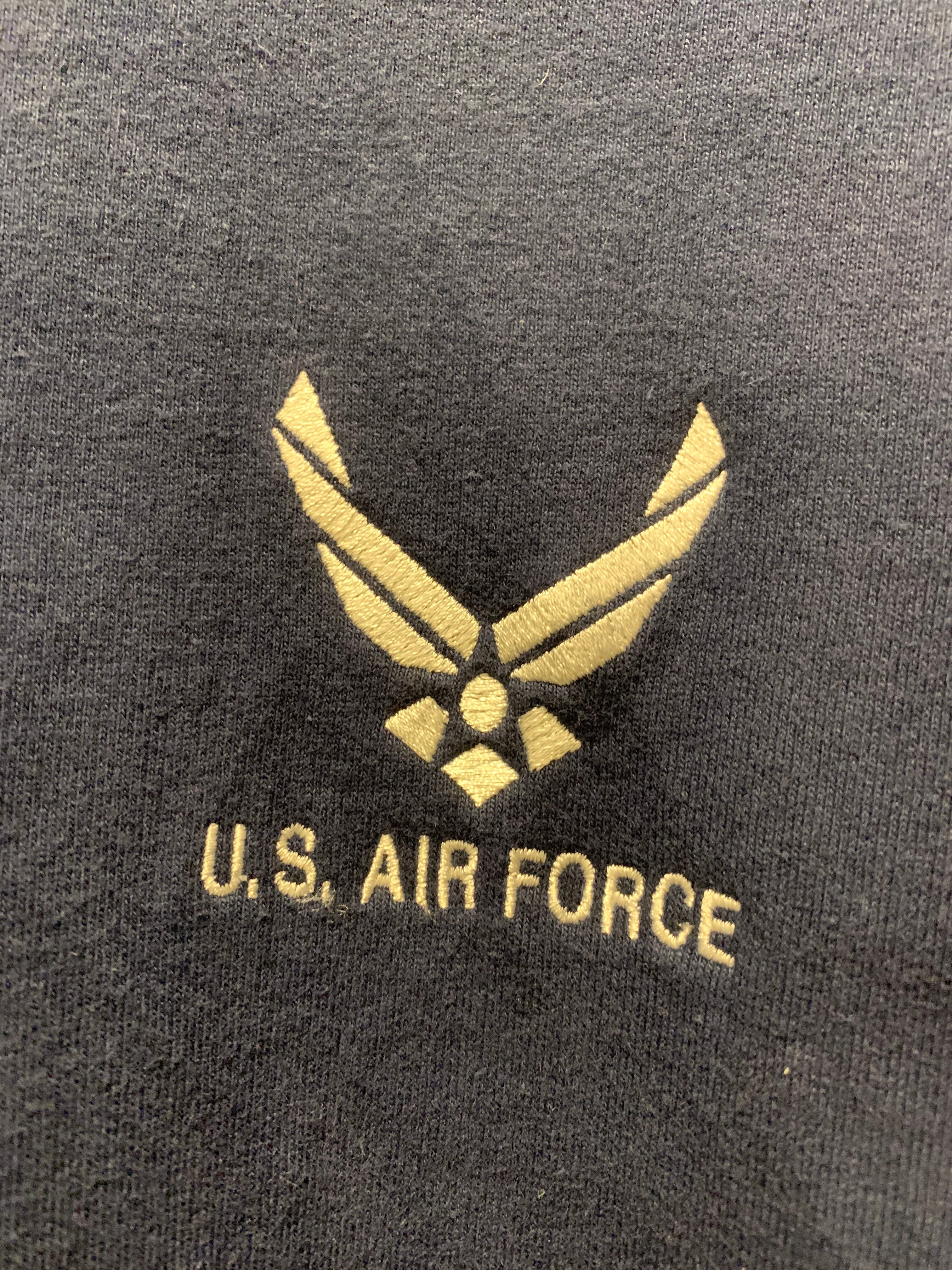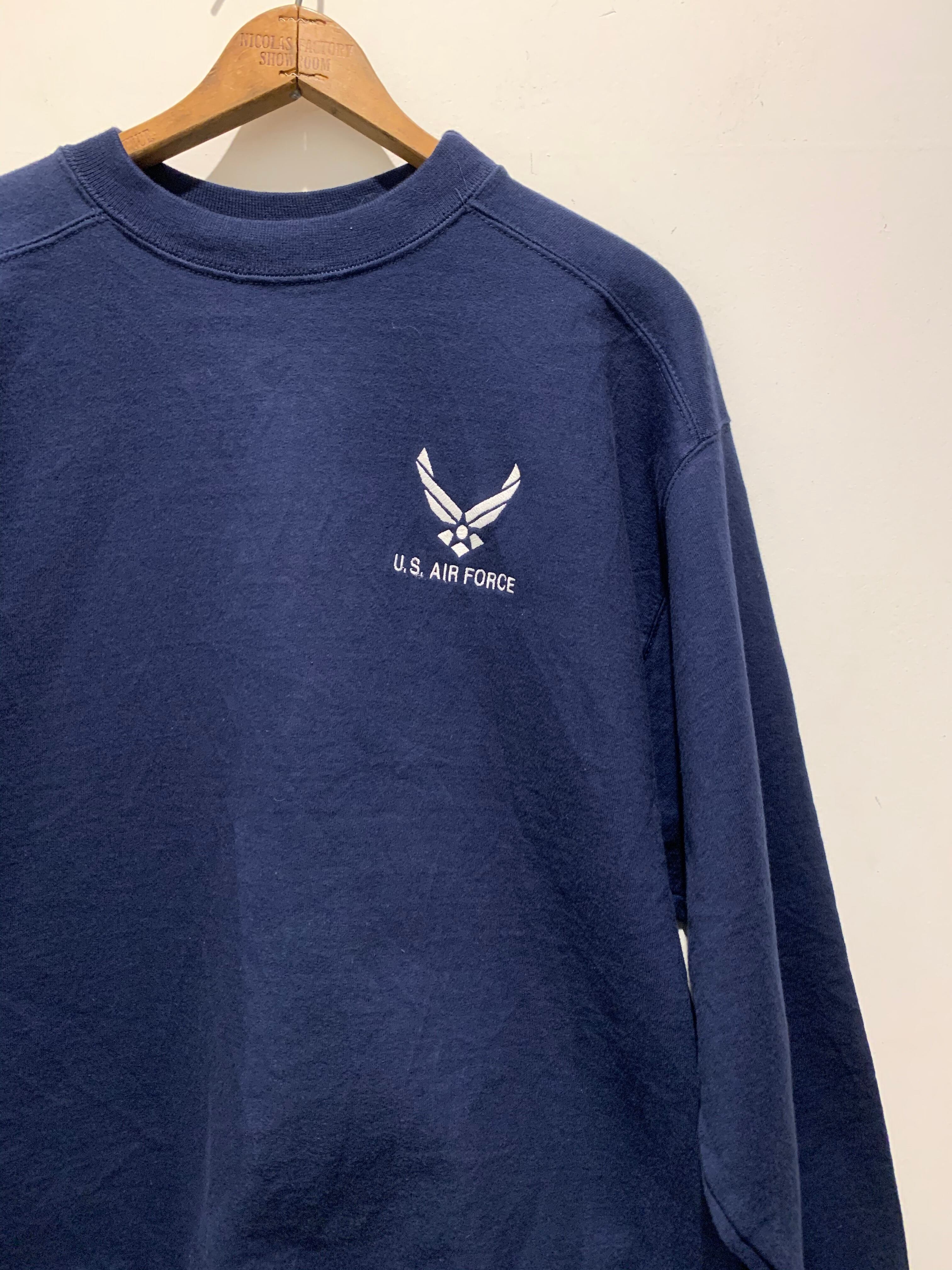 エアフォースの刺繍スウェットです。カラーがダークネイビーボディにワンポイントでシルバーの刺繍とシンプルながらかっこいい1着です。軍に卸していた物では無いのですがアメリカ製で肉厚な生地感と良い感じです。コンディションもとても良く裏起毛もまだフカフカでMサイズ表記ですが大きめな作りとなっていて男女問わずオススメです。