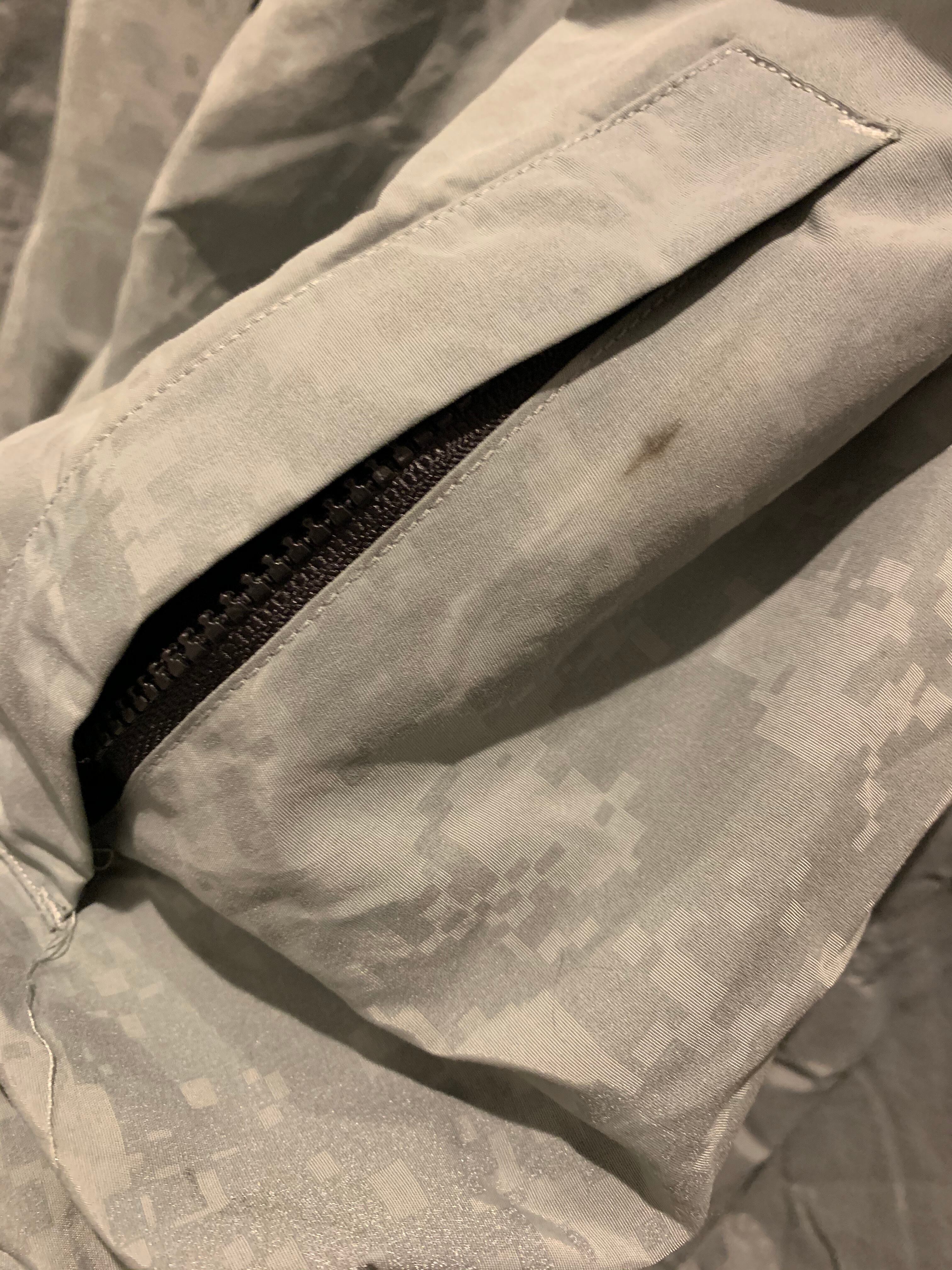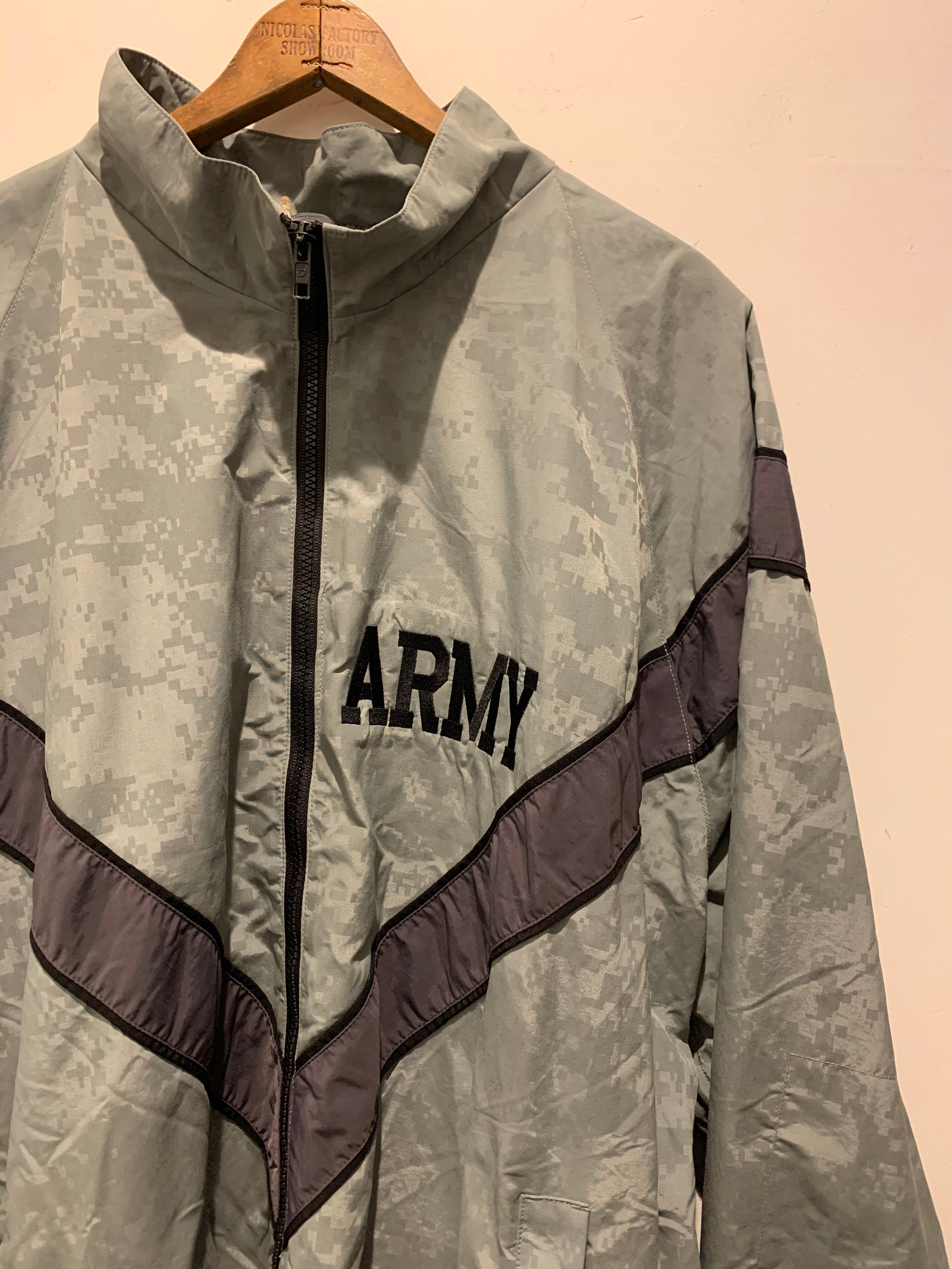 アメリカ軍のトレーニングジャケットです。グレーカラーにV字のリフレクターとシンプルですがかっこいい1着ですね。脇下のアジャスターやサイドポケットにもジッパー付きと機能面もバッチリです。デジカモバージョンでXLと大きめなサイズ感も良くLARGEサイズまでは見かけますがXLはあまり見かけませんね。大きめに着用したい方にオススメです。