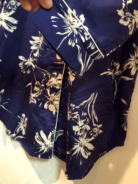 カラーはネイビーにホワイトの花柄です。薄手のコットン素材でパイピングがあったり胸に刺繍があったりと細かいところもこだわっている1着です。ボタンがレディース合わせですがメンズもいけるサイズ感です。ロング丈なのでスキニーパンツやワイドパンツとも相性が良さそうですね。