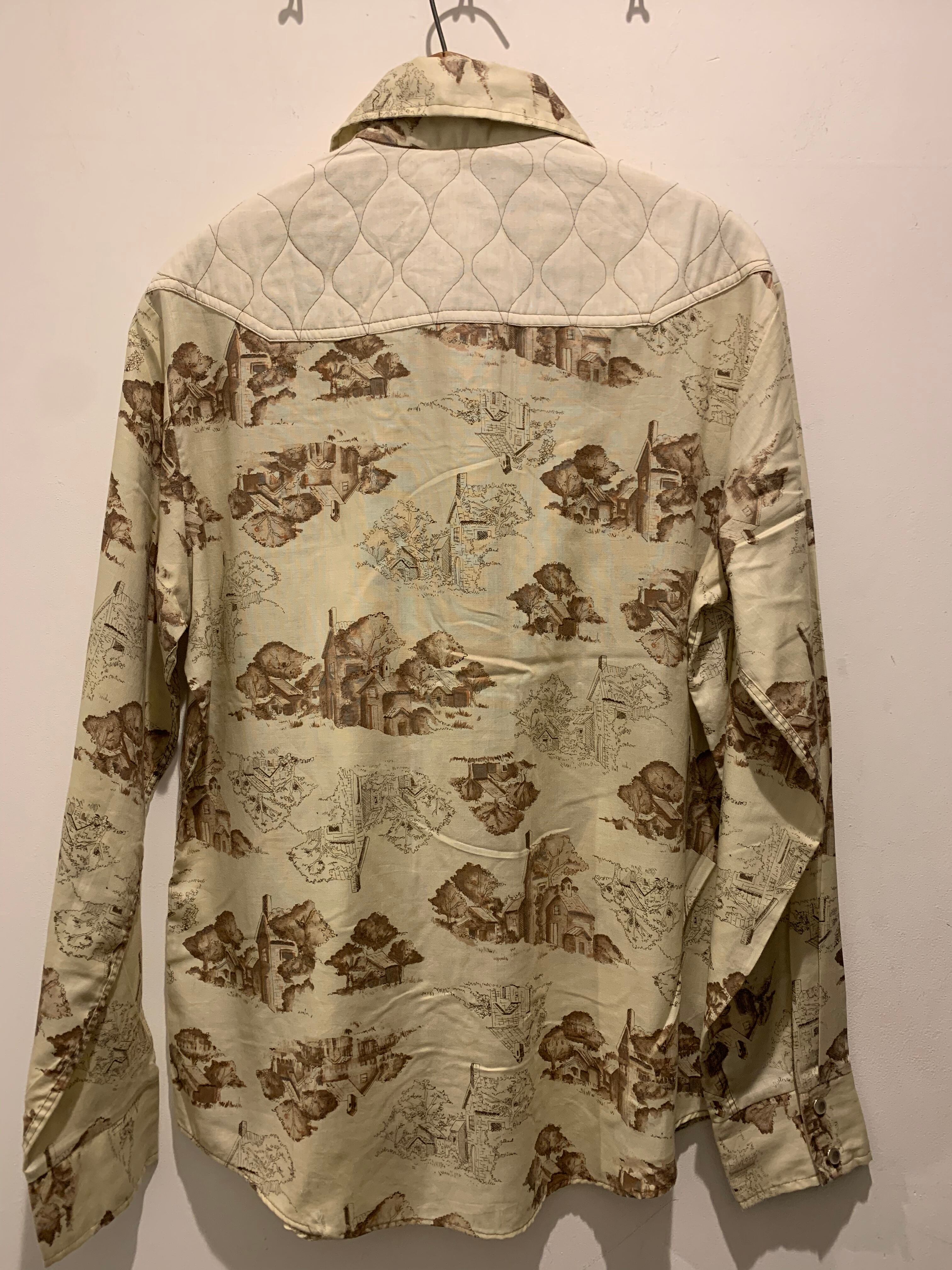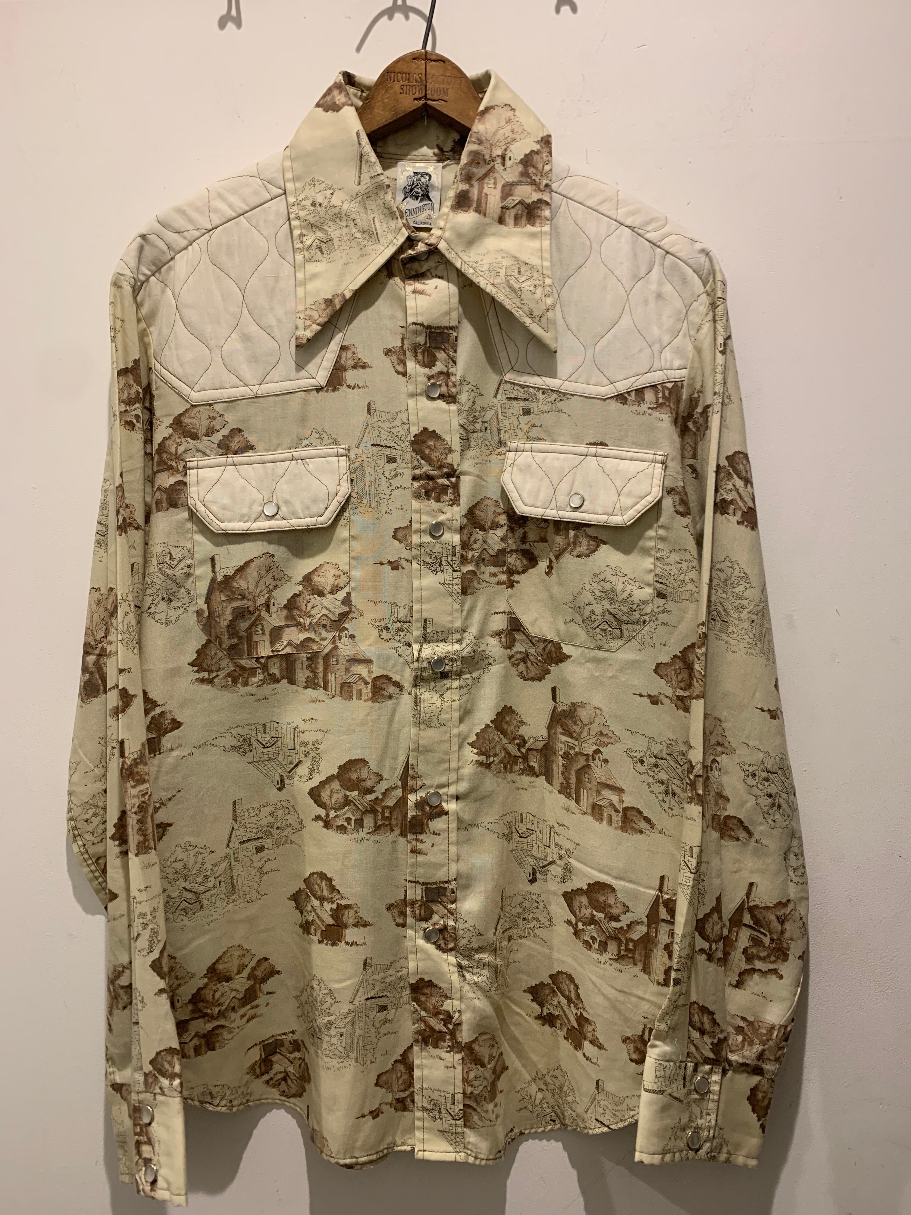 70年代ケニントンの総柄シャツです。ケニントンといえばディズニーのデザインのシャツが有名ですね。こちらはベージュカラーに昔の家のプリントが総柄でデザインされています。カラーもセピアカラーで雰囲気と色味がとても良く、70年代らしい大きめの襟とウエスタンがまた新鮮でかっこいいですね。デニムパンツやフレアパンツと相性良く男女問わずオススメなアイテムです。