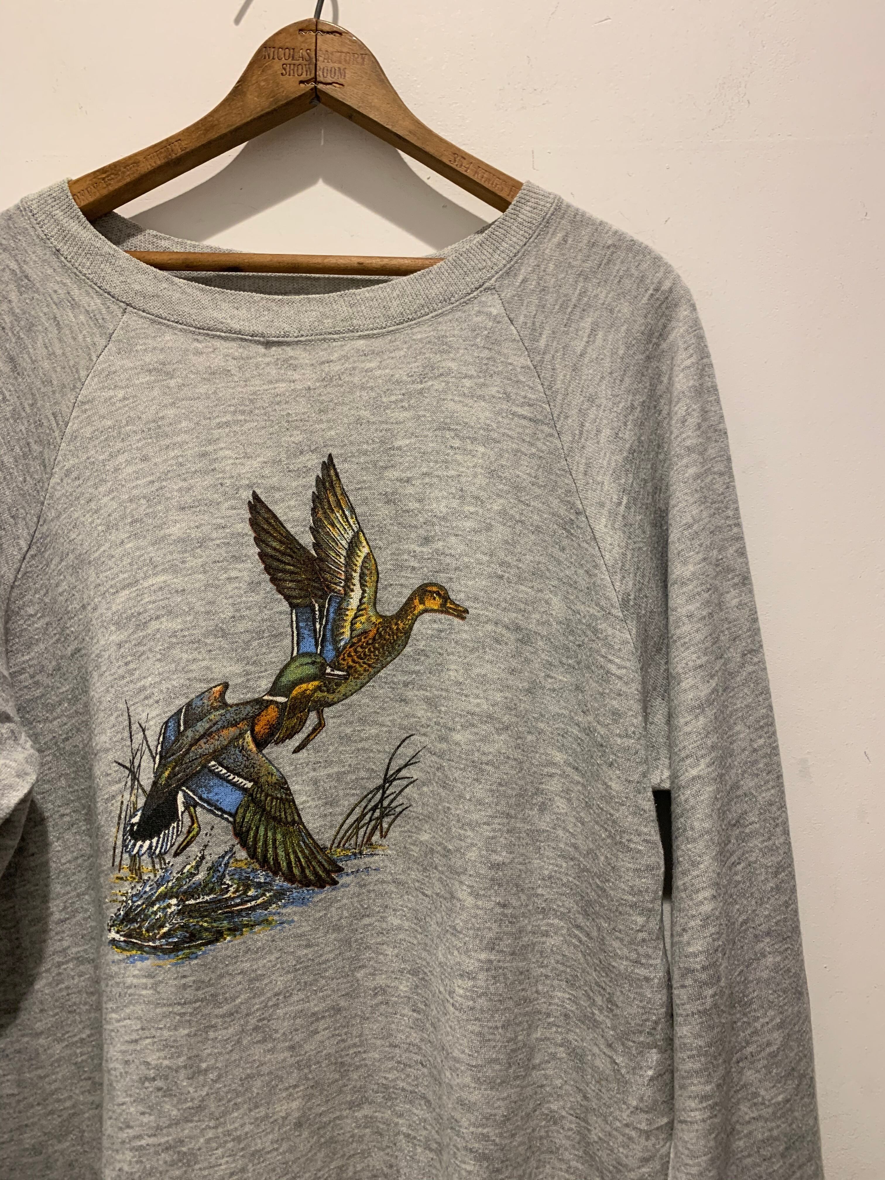 80年代アメリカ製チャンピオンのスウェットです。霜降りのグレーボディに鳥のプリントがデザインされています。このタイプですとロゴのカレッジ物が多い印象なのでこのプリントは珍しいですね。ラグランスリーブで肩が落ちて着用できるのもポイントです。デニム、ミリタリーパンツ、スカートなど幅広く相性の良いアイテムです。縮みも無く大きめなサイズ感でユニセックスでオススメです。