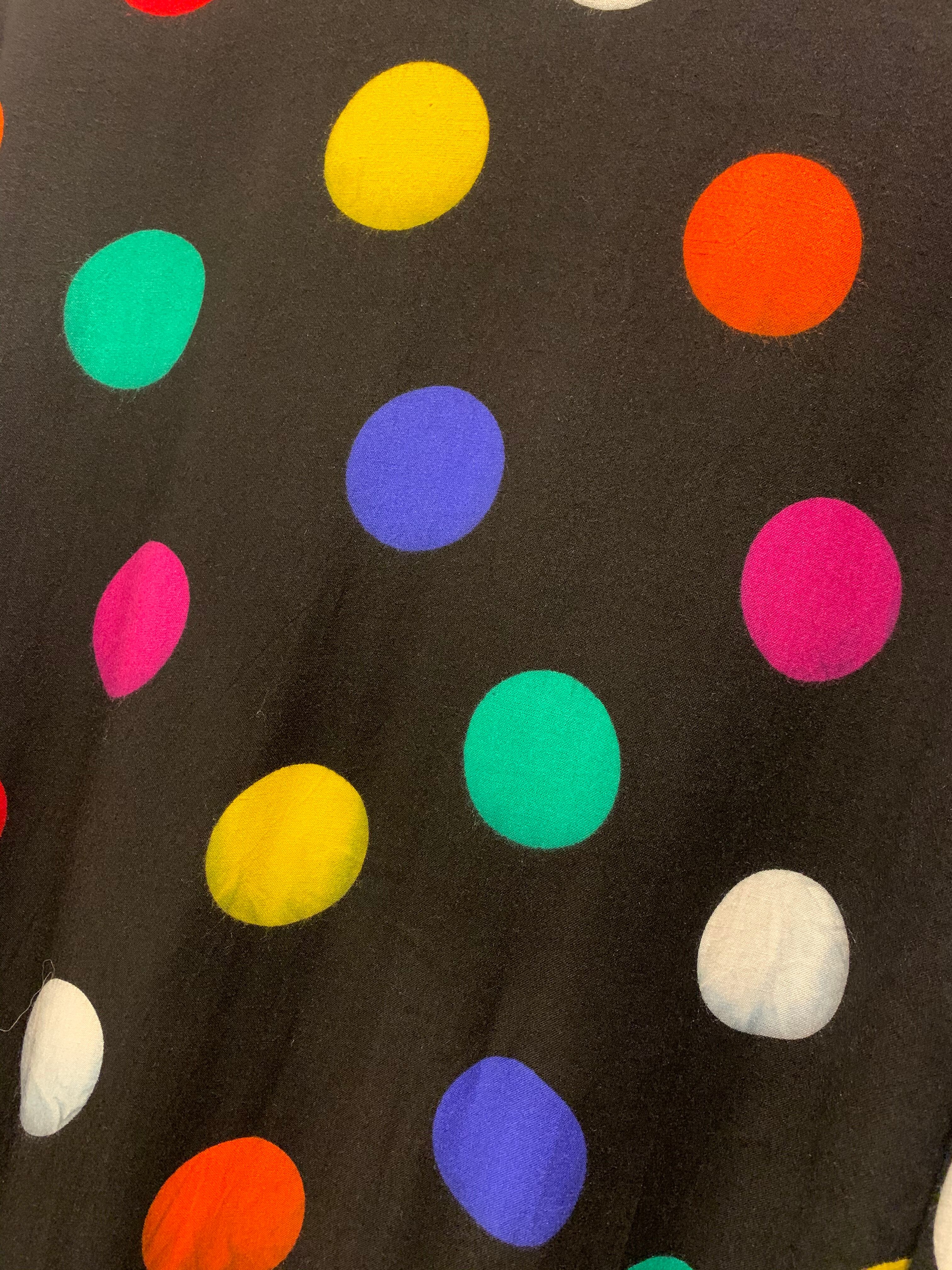 90年代のデザインレーヨンシャツです。ブラックカラーに大きめのカラフルなドットがデザインされています。細かいドット柄は見かけますが大きいカラフルなドット柄はあまり見かけなく珍しいですね。レーヨン素材なのでテロっとした質感も良く、肩の落ち感もありとても良い感じです。ブラックベースですが暗くなりすぎず、コンディションも良くオススメです。