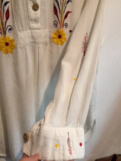 カラーはホワイトです。OLDのメキシカンシャツで刺繍も最近のと違い光沢感が無く、さりげない刺繍でバランスも良いです。バンドカラーのプルオーバーでウッドボタンを使用しています。袖先など細かい所にも刺繍があるのが良いですね。ガーゼ生地なのでサラッと着れてレイヤードもしやすい1着です。
