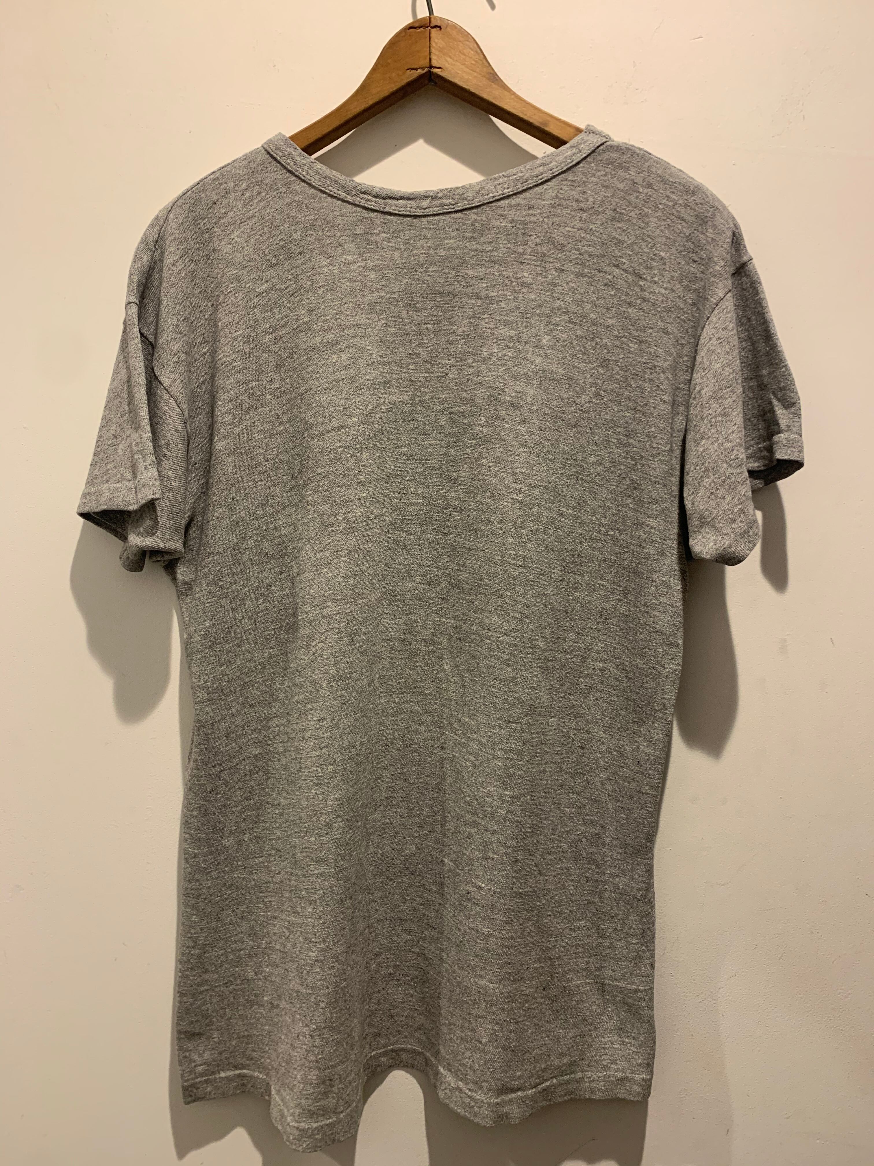 70年代アメリカ製チャンピオンのTシャツです。通称「バータグ」が付く70年代の物で霜降りグレーボディとなります。染み込みでサイズ表記のカプセルタイプとシンプルですが非常にかっこいい1着です。袖、裾ともにシングルステッチで袖にマークが入らないのも良いですね。小さいサイズが多い中、XLの大きめなサイズ感も良くオススメです。