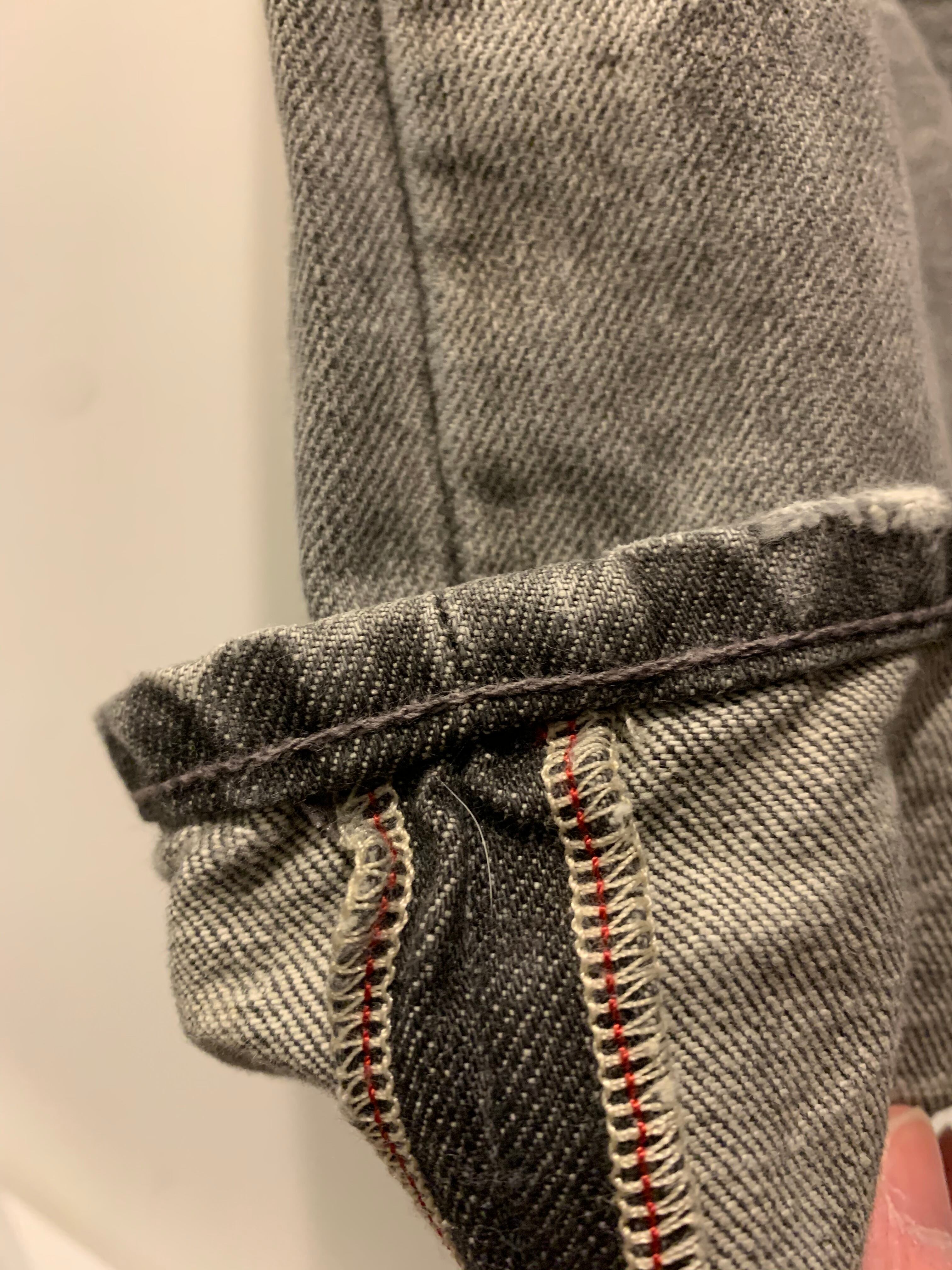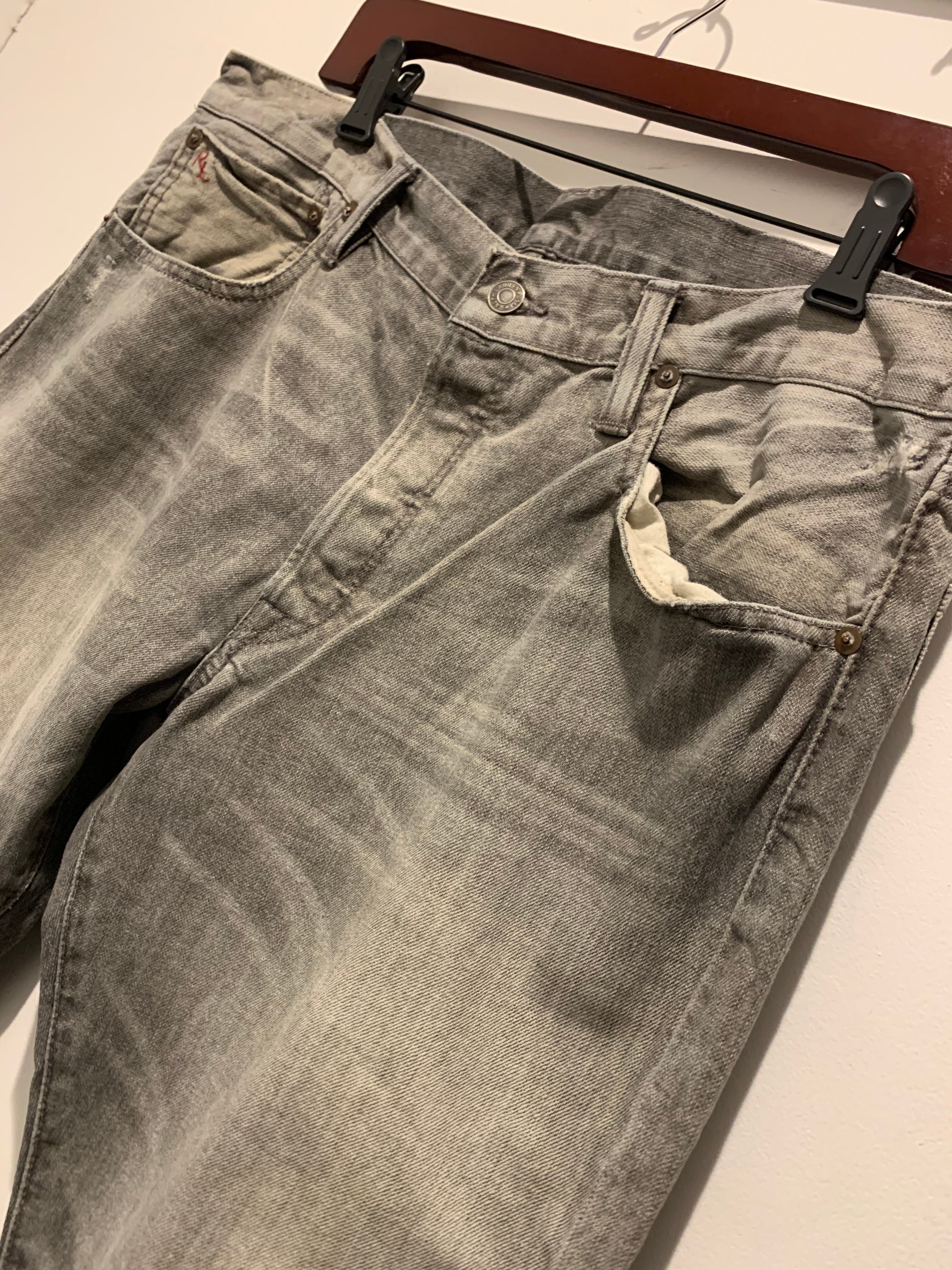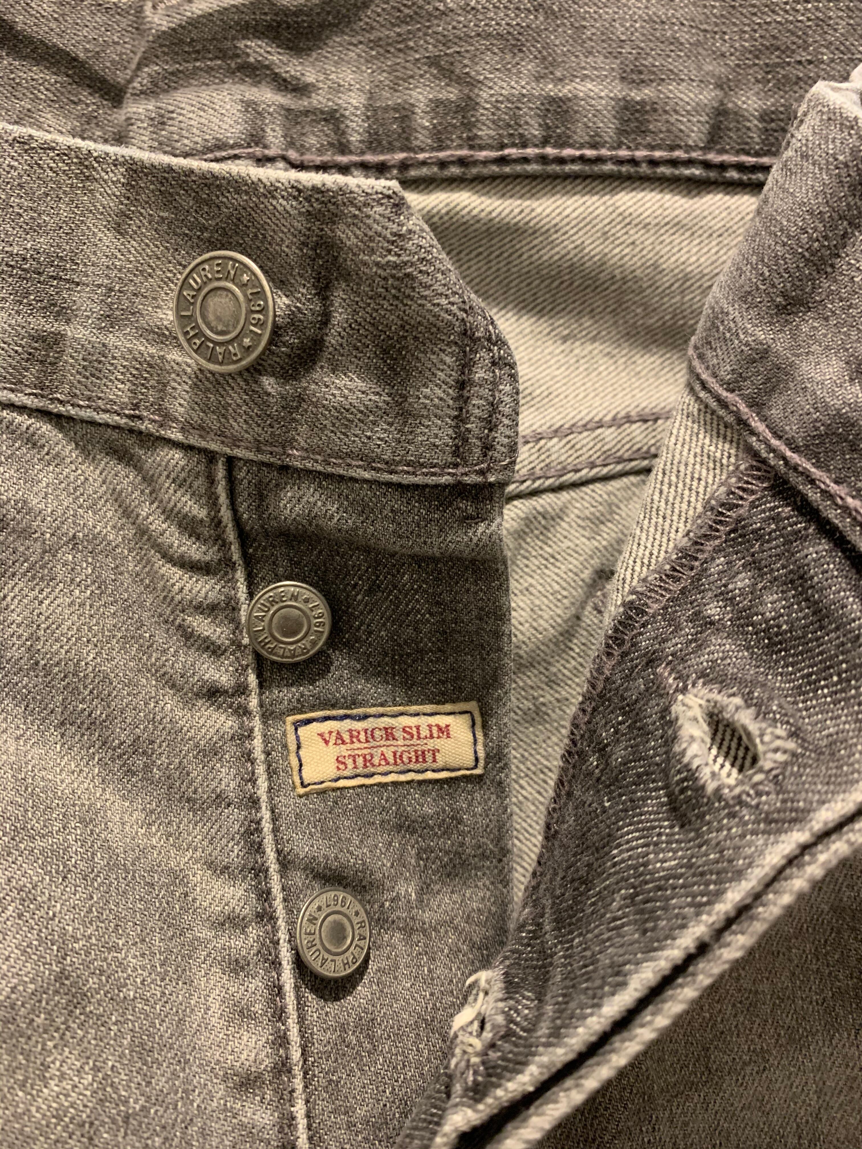 ポロ ラルフローレンのデニムパンツです。ブラックが色落ちしてグレーカラーのパンツでボタンフライタイプとなります。コインポケットにはRLの刺繍、リベットにも刻印が入ります。ヒゲや蜂の巣、裾のあたり、ダメージ加工などビンテージデニムを再現していてRRLのパンツに近い雰囲気でとてもかっこいいです。ウエストは少し大きめですがベルトで調整できオススメな1本です。