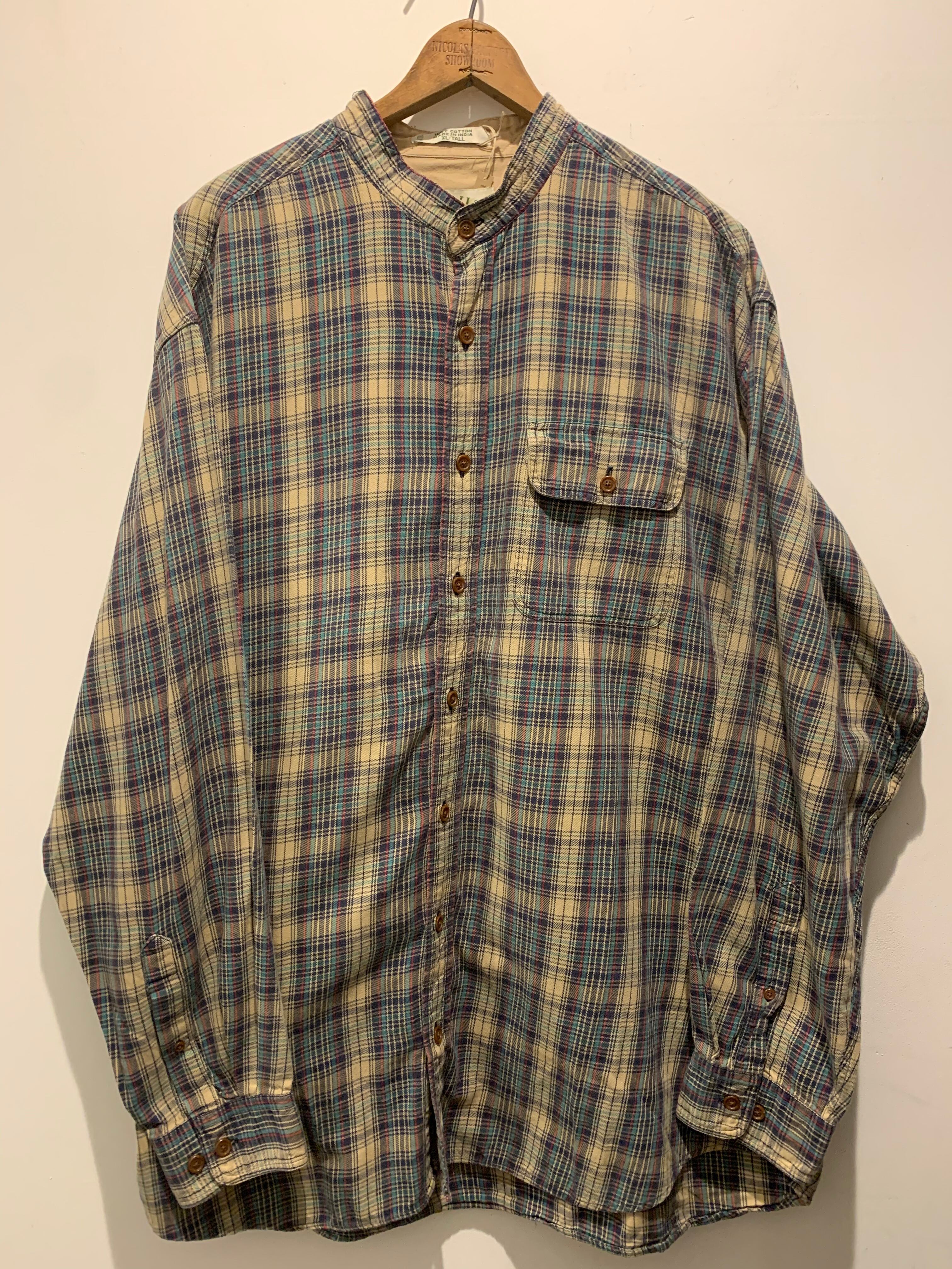 90年代オービスのバンドカラーチェックシャツです。ベージュ×ネイビーベースにターコイズブルー×レッドの配色となっています。バンドカラーでフラップ付きのポケットがシンプルですがかっこいい1着です。ポケット合わせもしっかりしていて柄が揃っているのも良いシャツの証拠ですね。90年代らしい大きめなサイズ感でユニセックスでオススメなアイテムです。