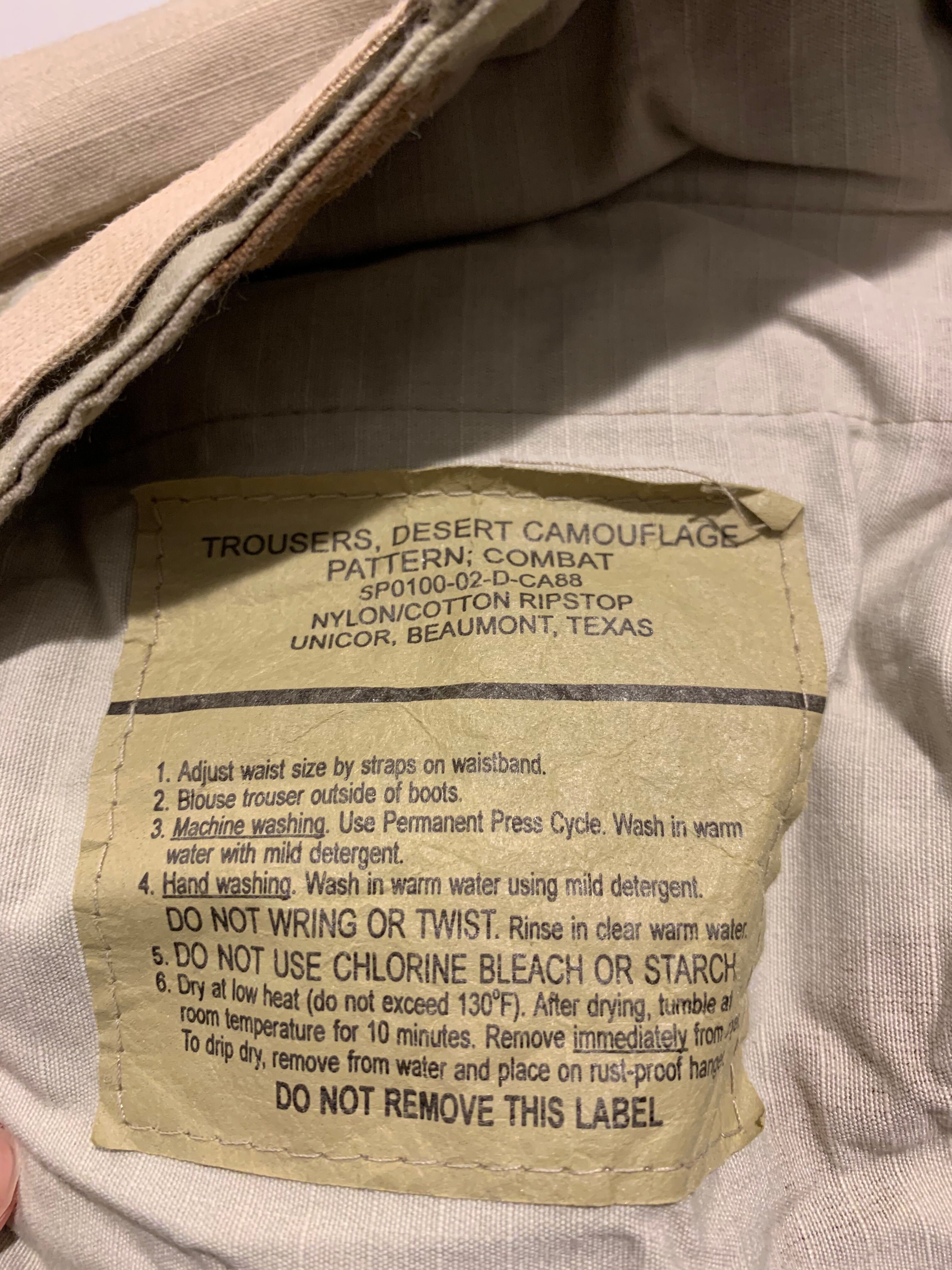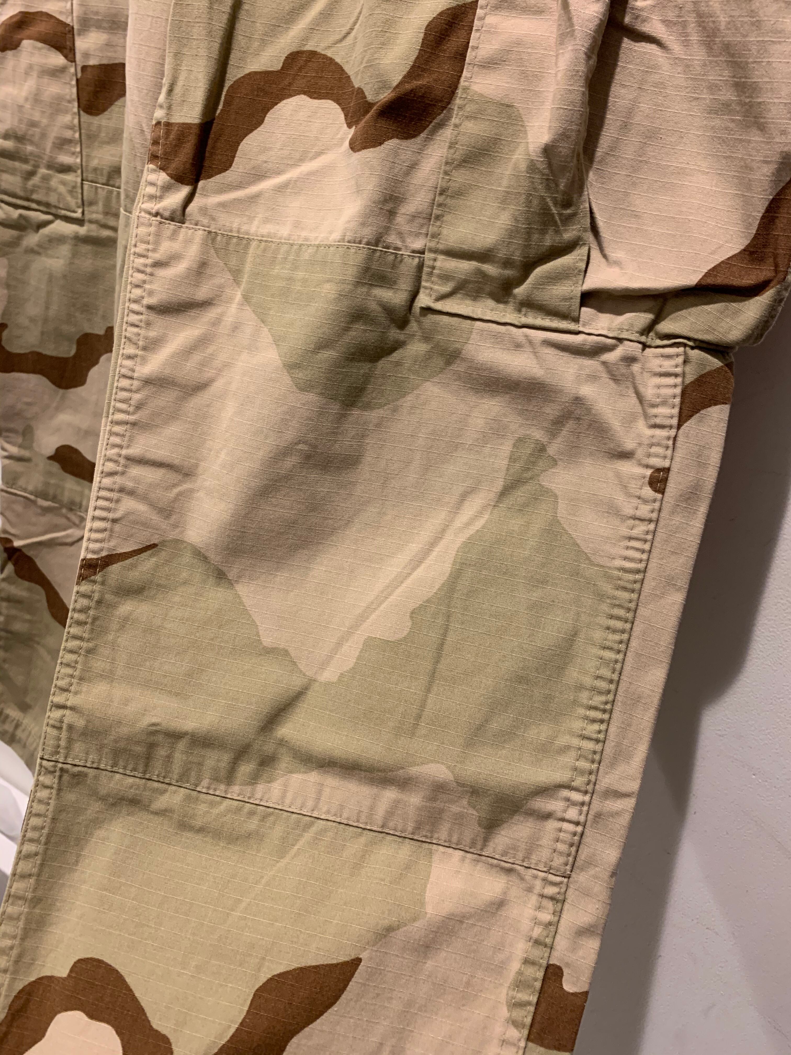 2002年USミリタリーのデザートカモフラージュパンツです。リップストップ生地でウエストはアジャスター付きなのでサイズ調整可能です。デザートカモは春・夏にもぴったりな迷彩でタウンユースで着用してもカッコ良いですね。サイズがM-Sと言うのも良いサイズ感で裾のドローコードで絞れるのもポイントです。デッドストック並みにコンディションも非常に良くオススメです。