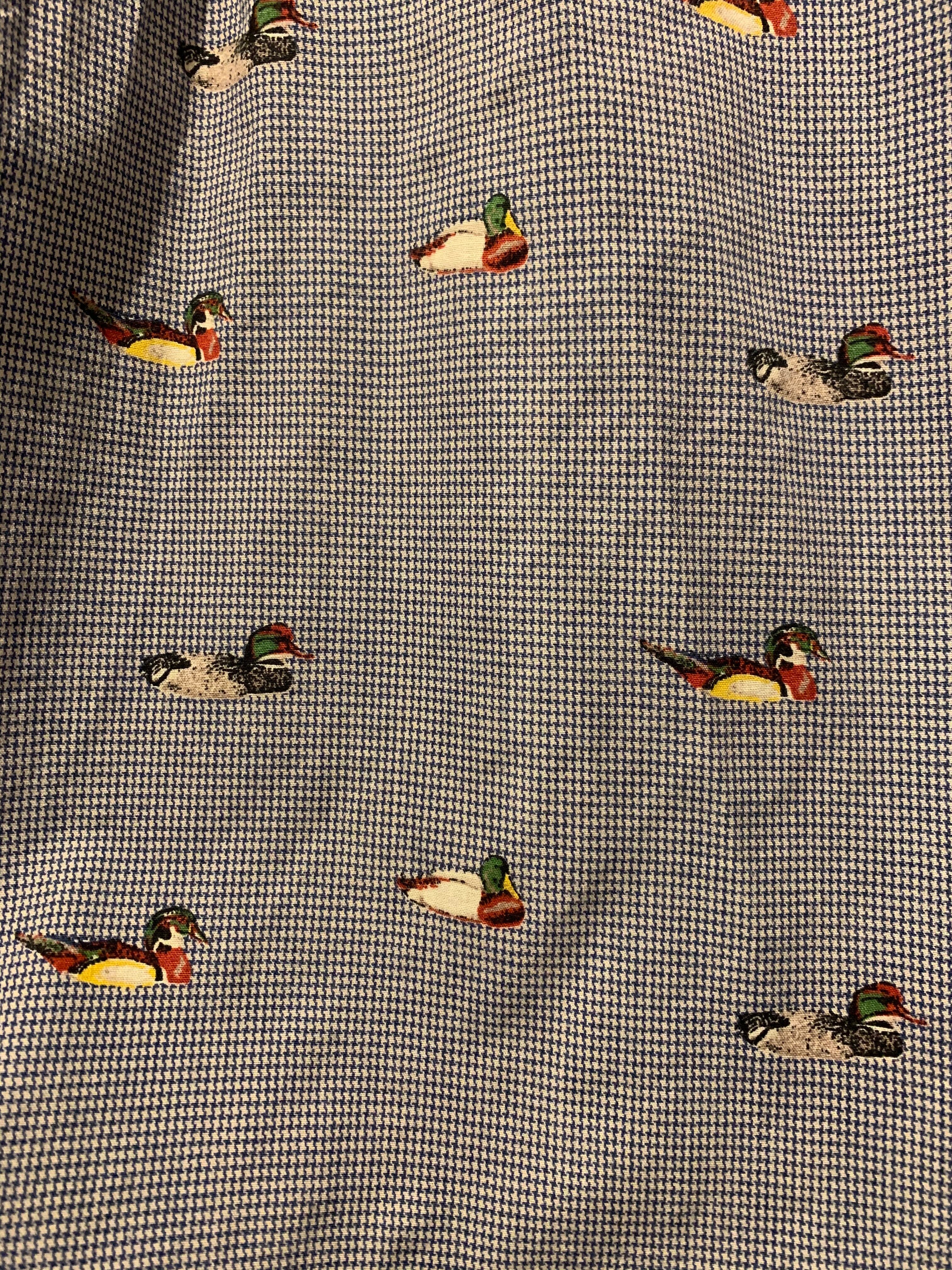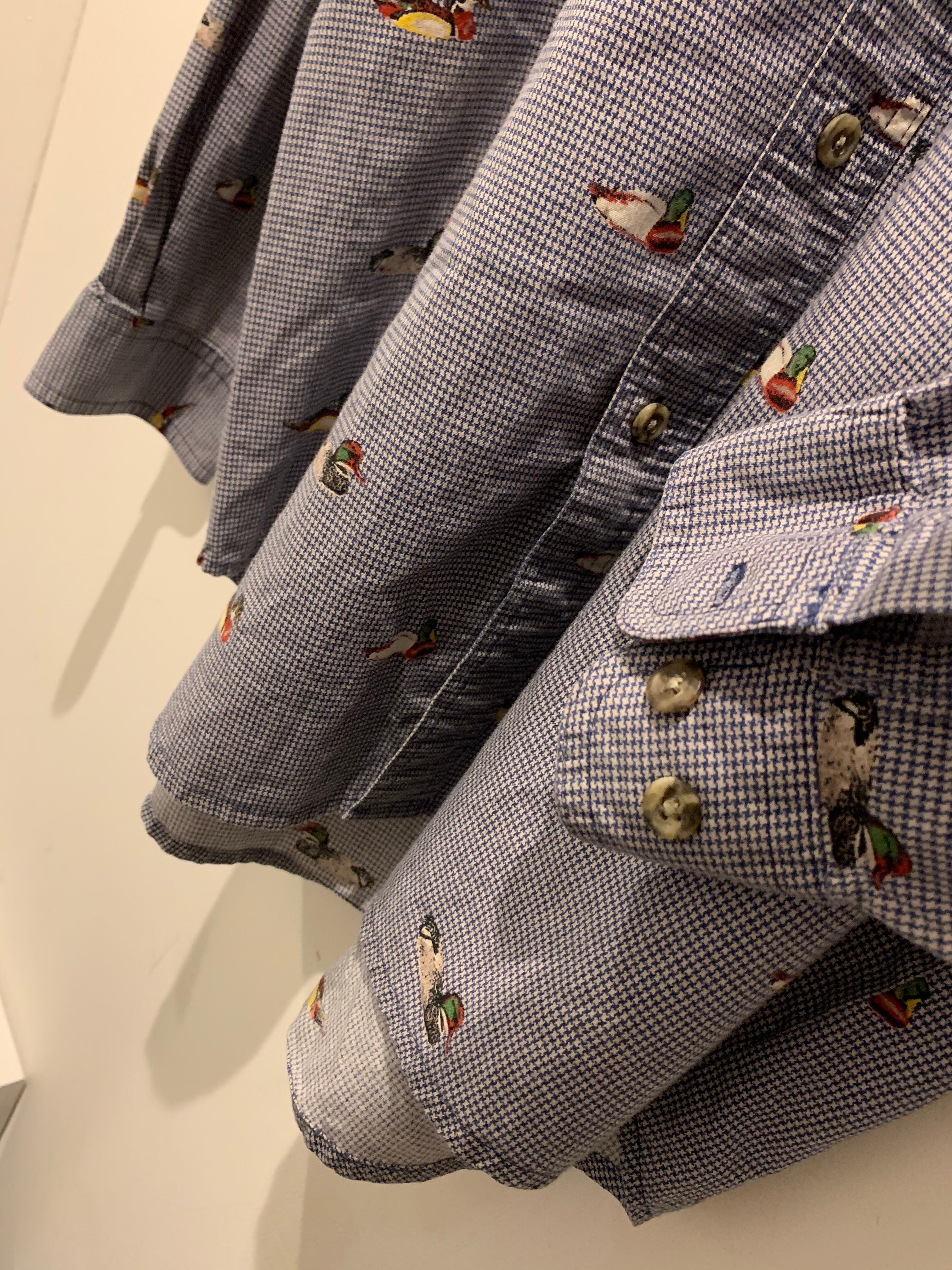 90年代ラングラーの総柄シャツです。千鳥格子に+鴨がデザインされていてなかなか見かけないデザインとなります。総柄ですが派手すぎない感じも良いですね。ポケットにはペン挿しもあり機能面も良くコットンの触り心地も良い感じです。サイズ表記はございませんがメンズのXL位のサイズ感でユニセックスでオススメなアイテムです。