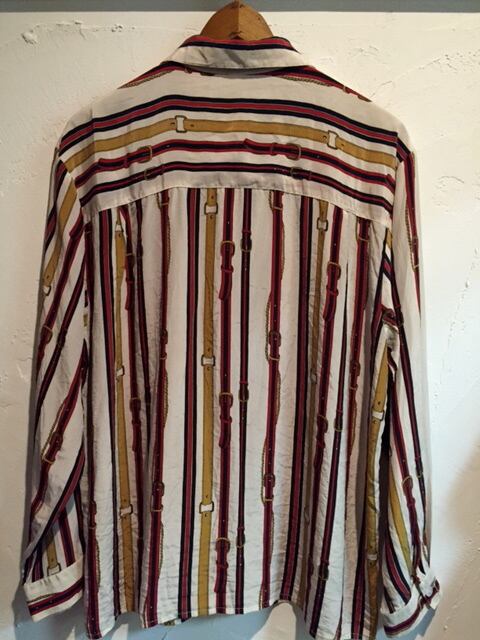 ベースカラーはホワイトです。様々なベルトがストライプになる様に縦にデザインされているオシャレな柄です。ボタンもシェル(貝)ボタンを使用し、素材も100%シルクと高い品質を誇っています。スカート、スラックスなどにINして着ても良いですし、ルーズに出して着用しても良いですね。