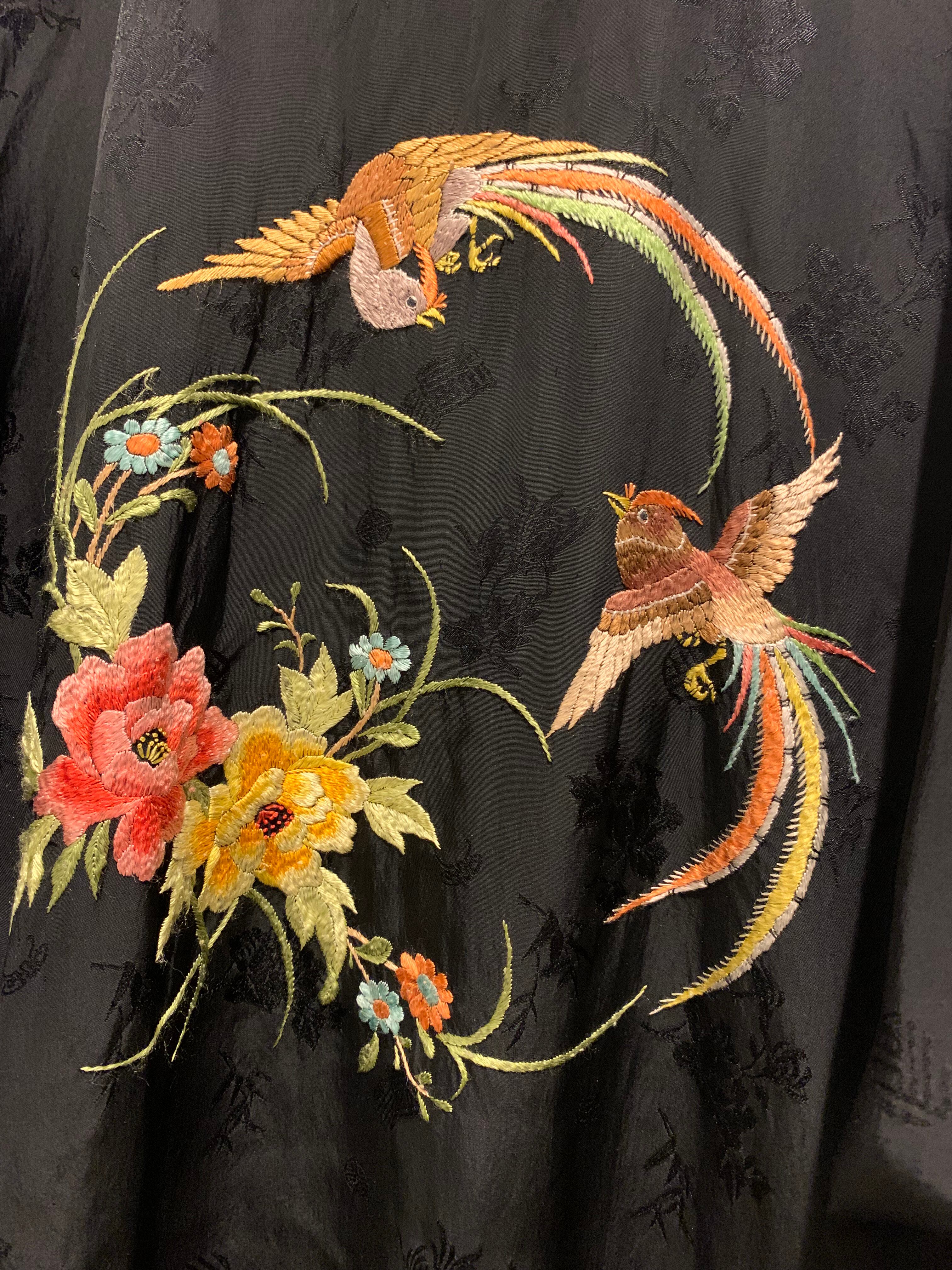 80年代のチャイナガウンシャツです。ブラックカラーに刺繍が入る良いデザインのアイテムです。フロントのポケットにもさりげなく刺繍が入るのもまた良いですね。そして黒の生地にも柄が入っているのもポイントです。レーヨン100%で落ち感もあり着用しやすくユニセックスでオススメです。