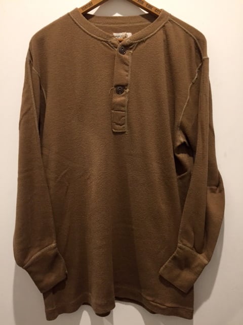 カラーはブラウンです。91年製のアメリカ軍のサーマルです。ヘンリーネックで猫目ボタンを使用しております。この形はセレクトショップでもリリースしていますね。ウールとコットンがMIXで入っているので温かさもございます。ブラウンなのでトップスにデニムやブラックのアイテムを持ってこれるのも良いですね。