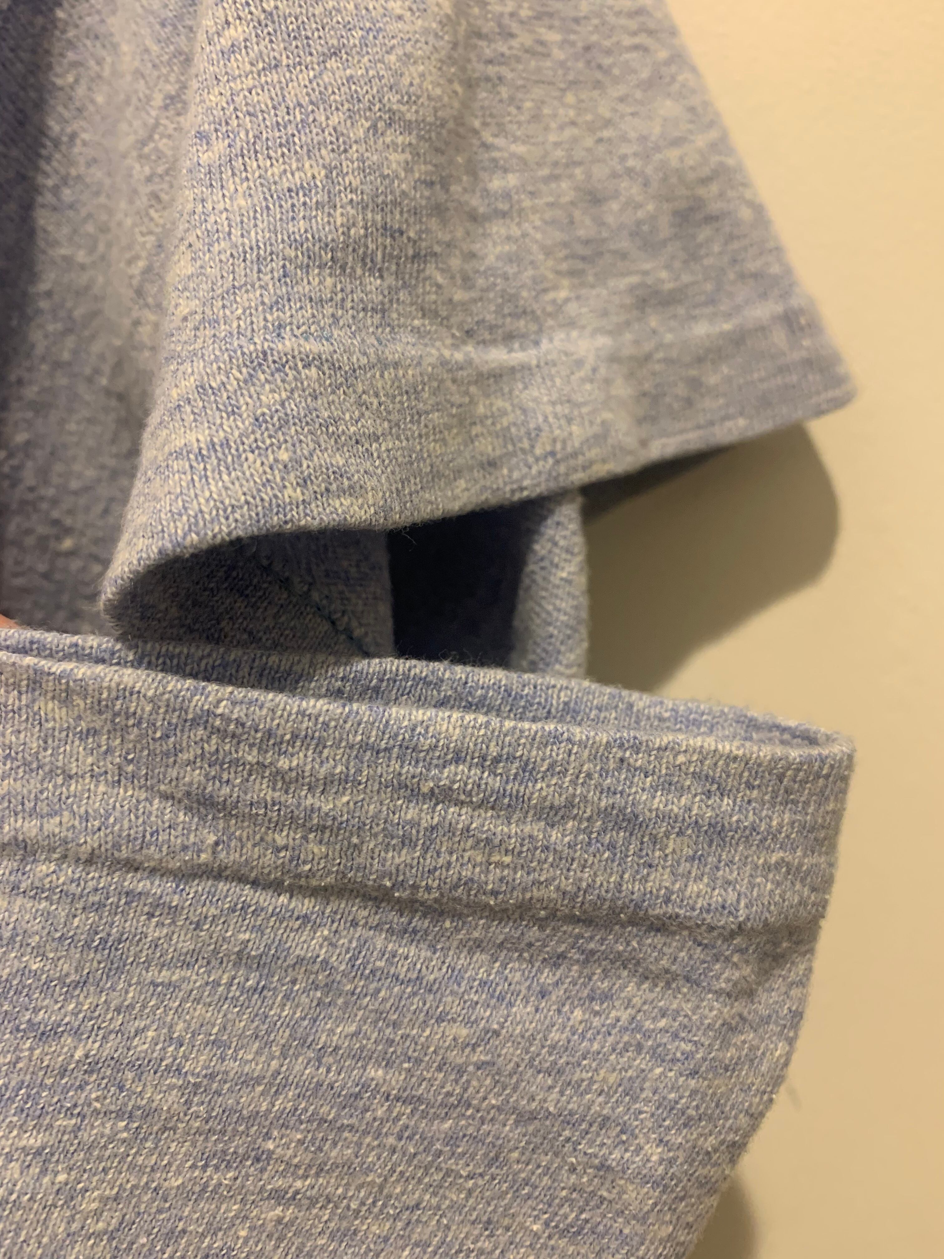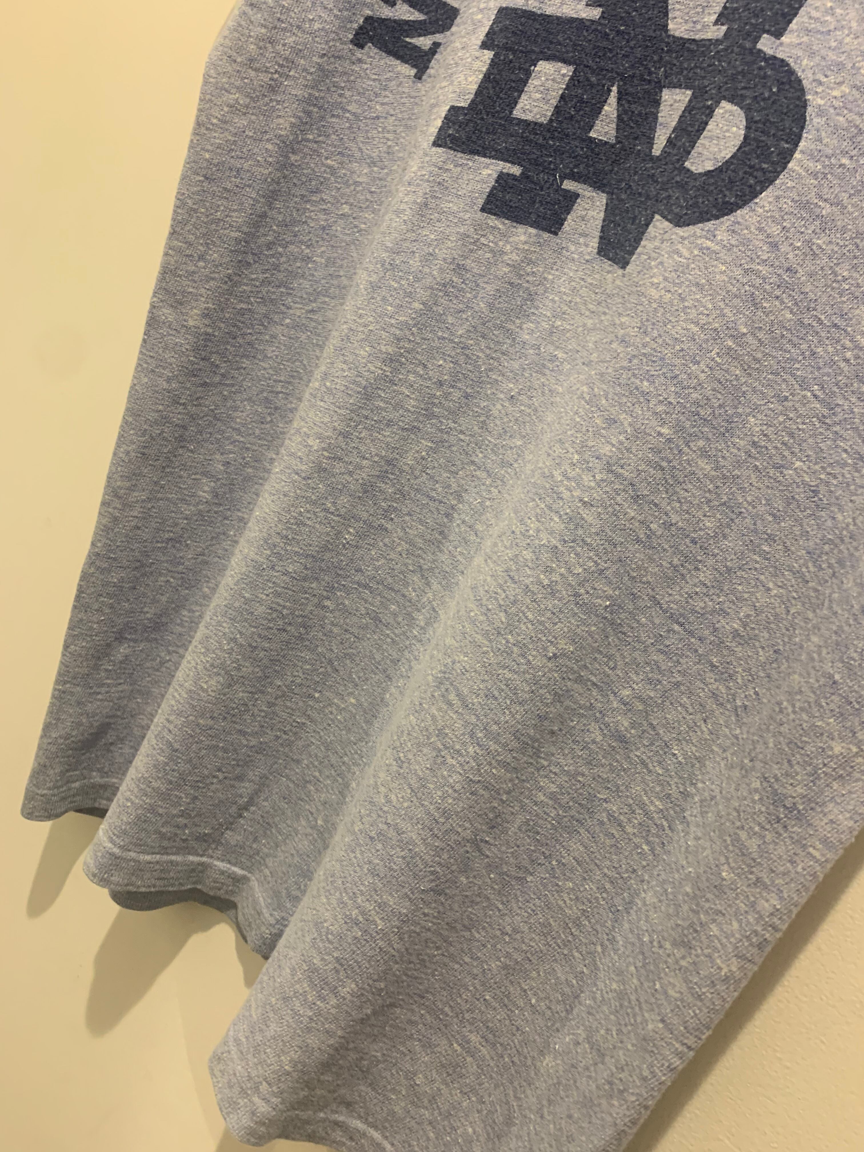 70年代のアメリカ製チャンピオンTシャツです。1970年代の通称バータグが付く物となります。ブルーの霜降りボディにノートルダムのロゴとマークが染み込みプリントでデザインされています。ロゴが深めなアーチになっているのもとても良いですね。袖、裾ともにシングルステッチで袖にマークが入らないのもシンプルで良いですね。この素材は着心地も良くユニセックスでオススメです。
