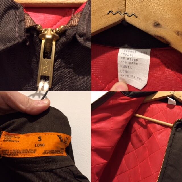 カラーはダークブラウンです。アメリカ製のワークジャケットでインナーはレッドのキルティングが付いているので風を通さず温かい1着です。襟元に紙タグが、もう1つ襟の中にもタグが付きます。左袖にポケットがあり襟付きのMA-1の様な形です。サイズがSサイズのロング丈と少しゆったりなサイズ感も良いですね。