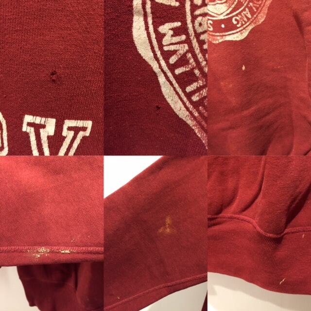カラーはエンジです。Vintageスヌーピーのスウェットにも使用されるSPRUCEタグが付きます。HARVARD物で文字がアーチがかりシンプルなデザインが良いですね。100コットンのザラッとした質感に所々あるペンキがかっこいい1着です。