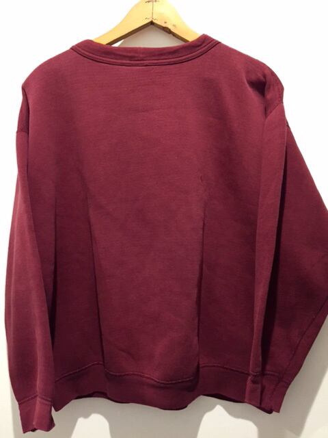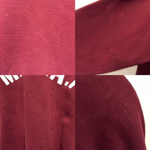 カラーはエンジです。首元にガゼットが付く通称前Vのヴィンテージスウェットです。カラーもグレーや紺はよく見ますがエンジボディは珍しいですね。ロゴはラバーでミリタリーにありそうなバランスのロゴでかっこいいです。ダメージが所々ございますが今の新品には出せない感じが最高な1着です。
