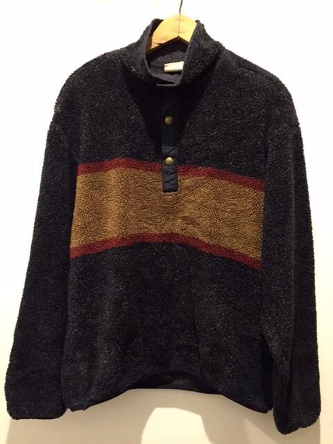 カラーはネイビーです。ウールリッチのフリースで毛足の長いパイル地が良いですね。ボタンにロゴの刻印入りで裾に付くタグが赤黒のブロックチェックでさりげないところもこだわりがあります。パタゴニアとは違う良さがありオススメです。
