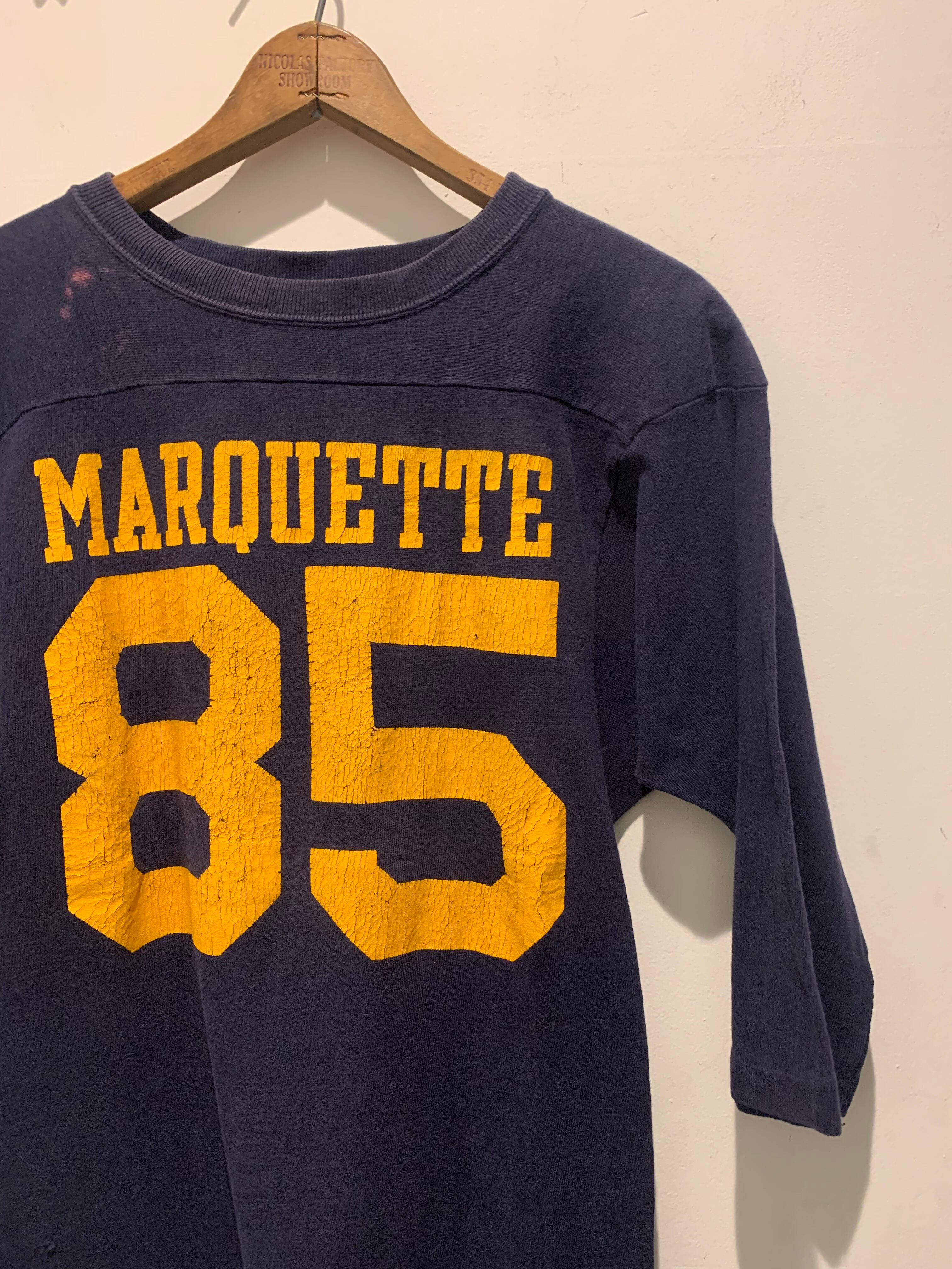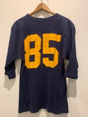 80年代アメリカ製チャンピオンのフットボールTシャツです。通称バータグが付くコットン100%のタイプとなります。少しフェードしたネイビーボディにイエローのラバープリントで85のナンバリングが入ります。バッグにもナッバリングが入りひび割れたプリントが雰囲気ありかっこいいですね。メンズSサイズなので女性の方がデニムやミリタリーパンツと合わせて着用してもオススメな1点です。