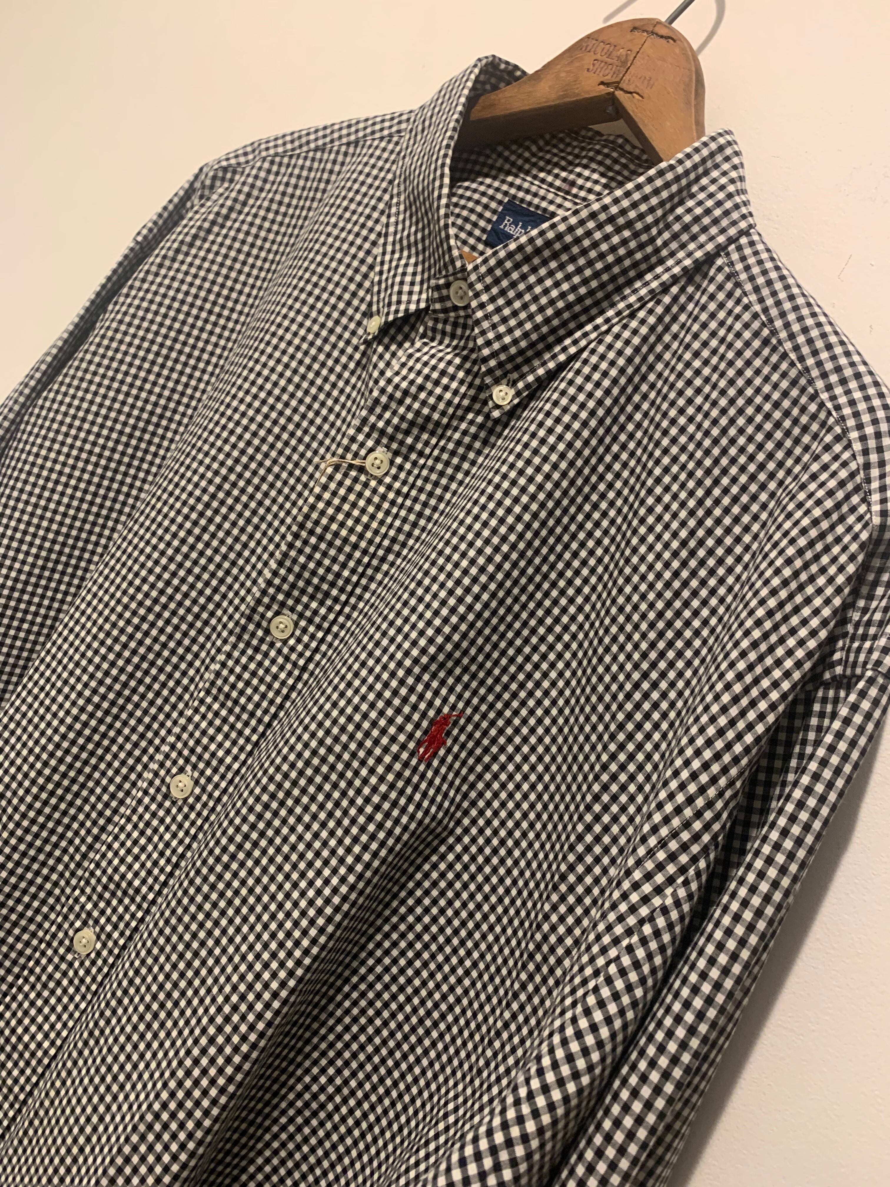 90年代ラルフローレンのギンガムチェックシャツです。ブラック×ホワイトカラーにポニーマークが赤の刺繍となります。モノトーンのカラーが使いやすくて良いですね。90年代らしい大きめな作りでパーカーの上に羽織ってストリートっぽく着用してもお洒落な1着ですね。コンディションも良くユニセックスでオススメです。