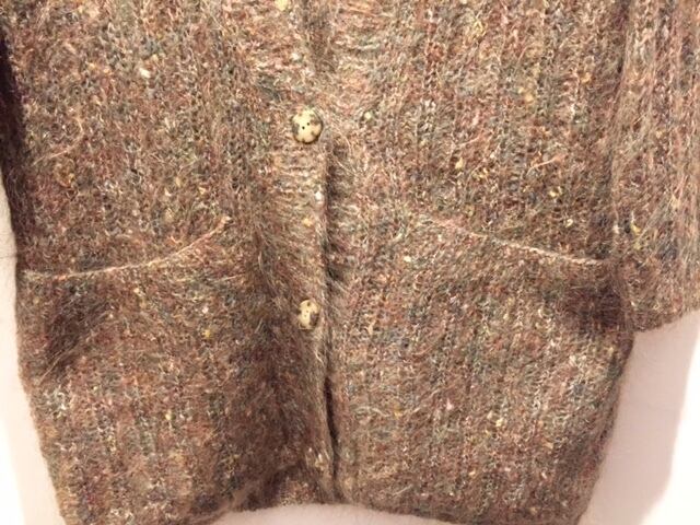 モヘア60%で毛足の長いモヘアを使用しています。大きめサイズで2つポケットも付きます。ボタンがレディース合わせですがメンズも問題無く着れるアイテムです。年代はそこまで古くはないですが毛足が長いモヘアで大きめに着用出来るのは良いですね。