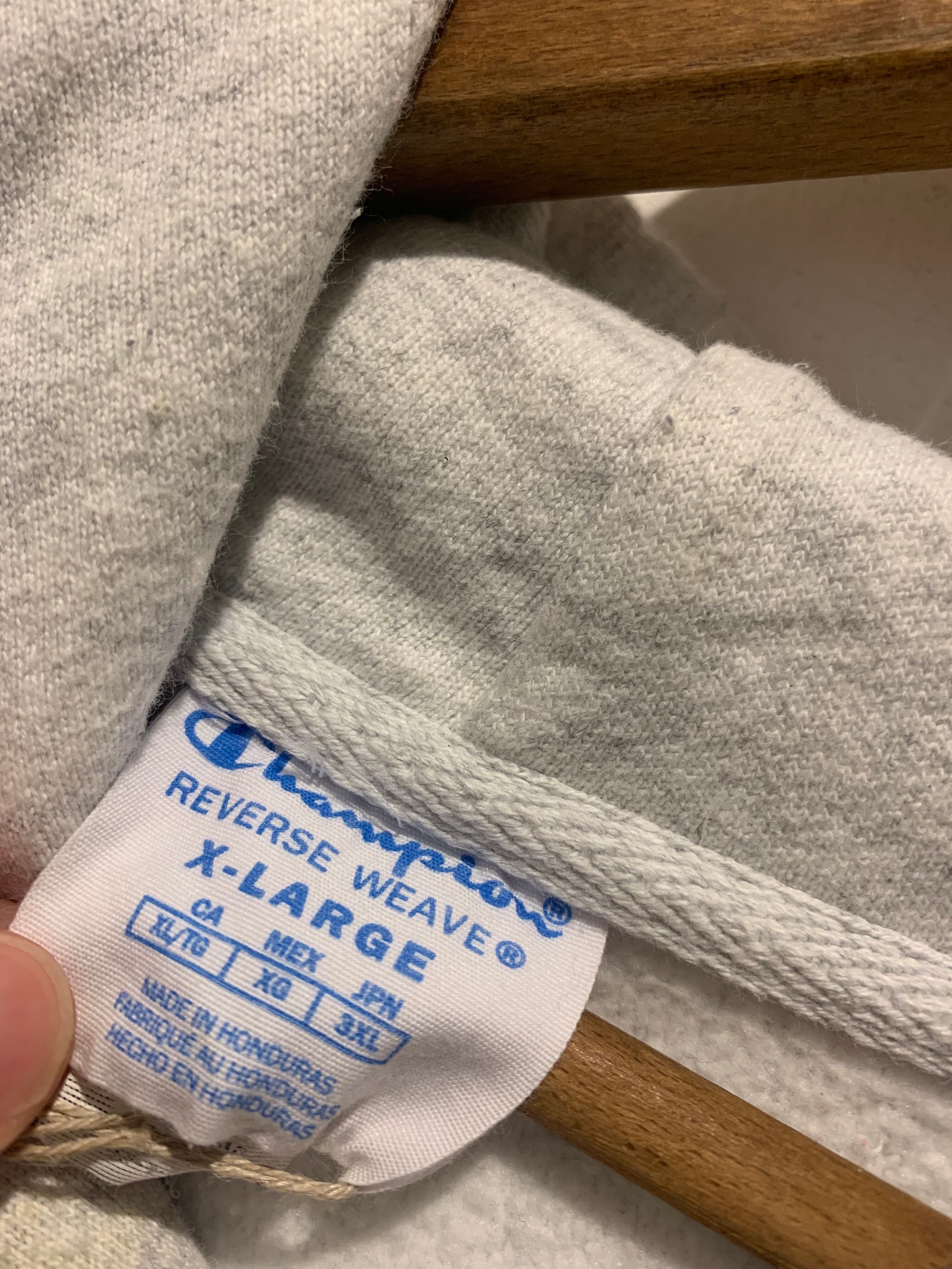チャンピオンリバースウィーブのパーカーです。アメリカ企画のリバースウィーブでグレーボディにネイビーの染み込みプリントとなります。リバースは丈夫な作りとフードがしっかり立つのが魅力的ですね。3XLサイズですが着丈が長すぎないのも着やすくゆったり着用できる良いサイズ感でオススメです。