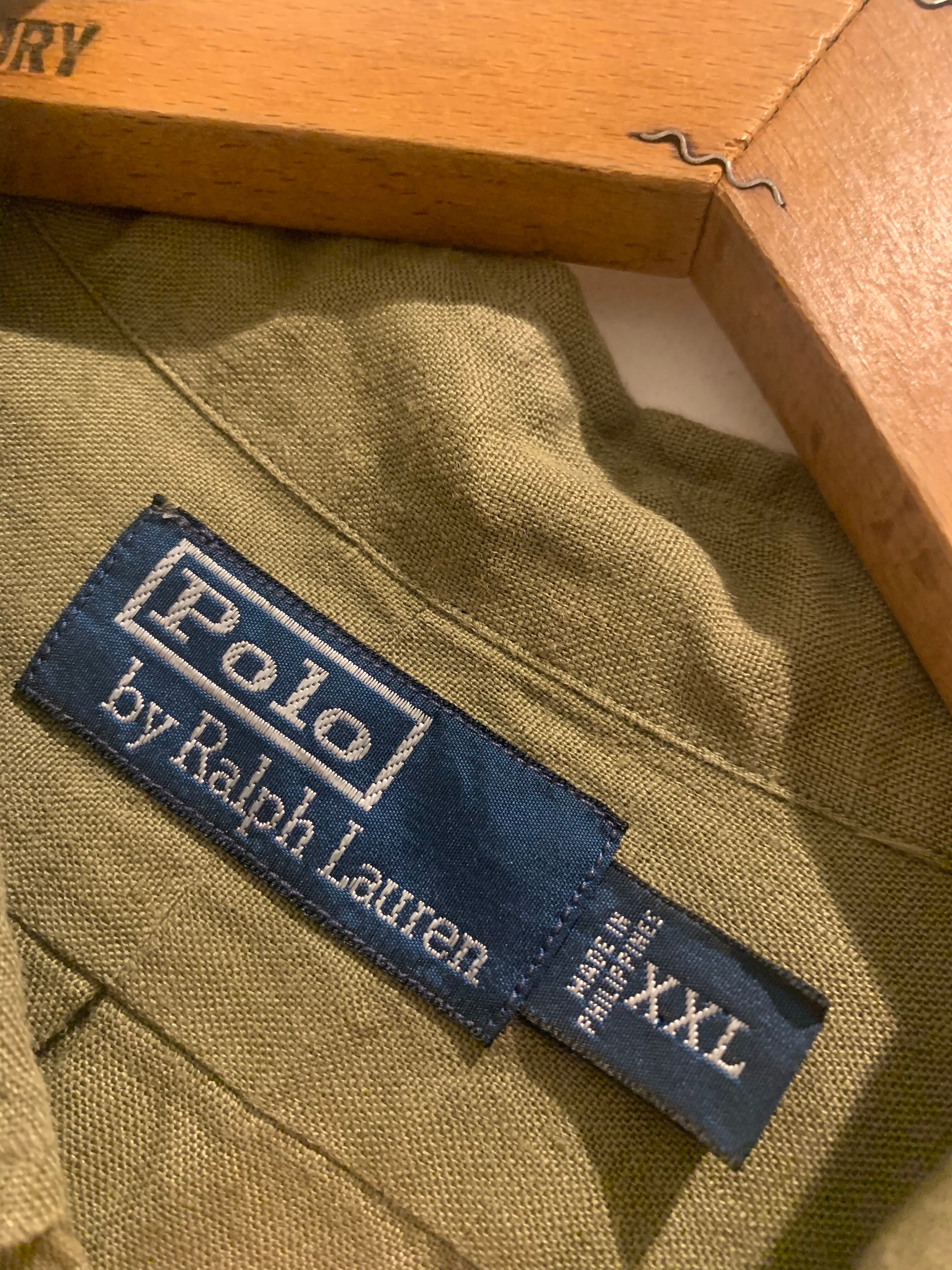 ラルフローレンのリネンシャツです。オリーブカラーでポニーマークが付かないタイプとなります。フロントにフラップ付きの2ポケットとミリタリーのようなカラーリングがとても良い1着です。XXLサイズですが身幅はありますが着丈はそこまで長くないのもバランスが良くオススメです。