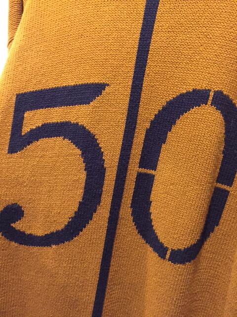 ナイロン系のアイテムが多い中、珍しいコットンニットとなります。マスタード×ネイビーと古着好きではこの配色が好きな方も多いのでは無いでしょうか?ゆったりしたサイズ感でバッグには50番、袖には40番のナンバリングがはいります。アメフト好きな方にもオススメアイテムです。