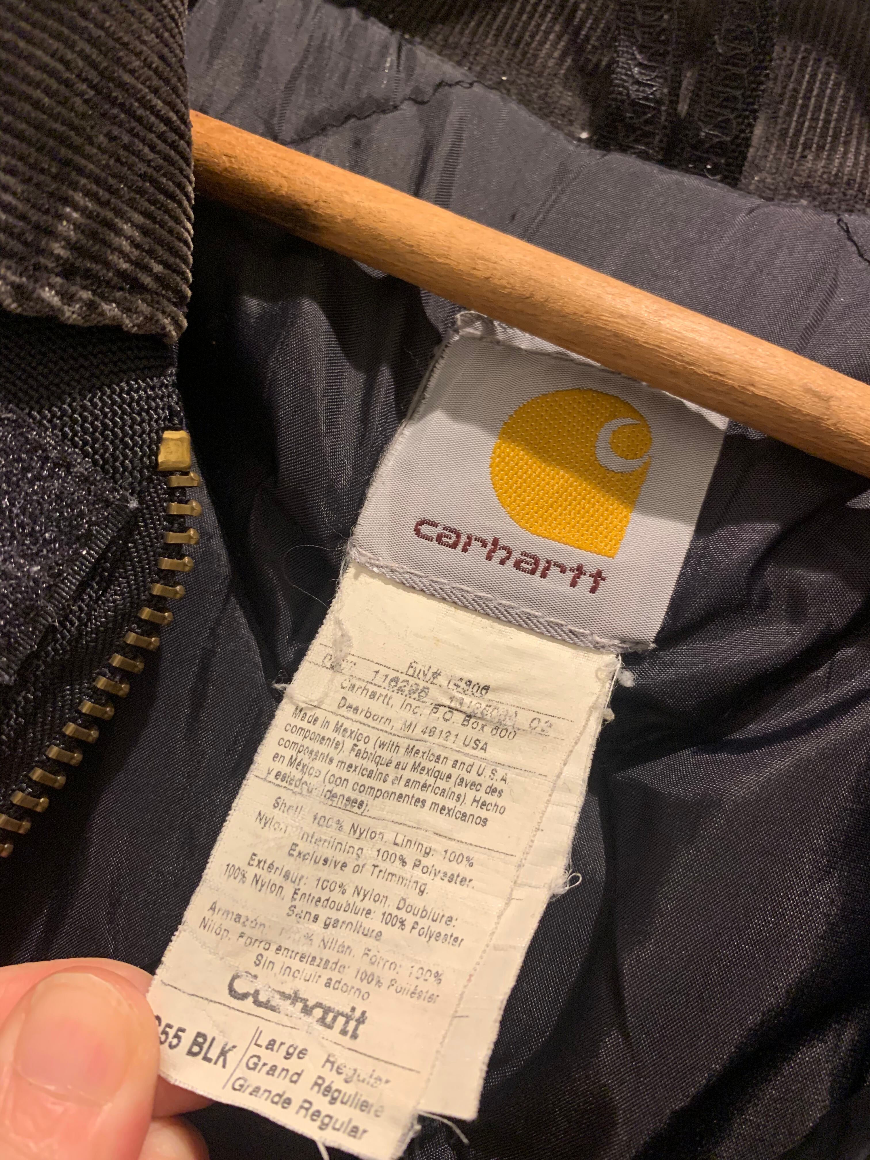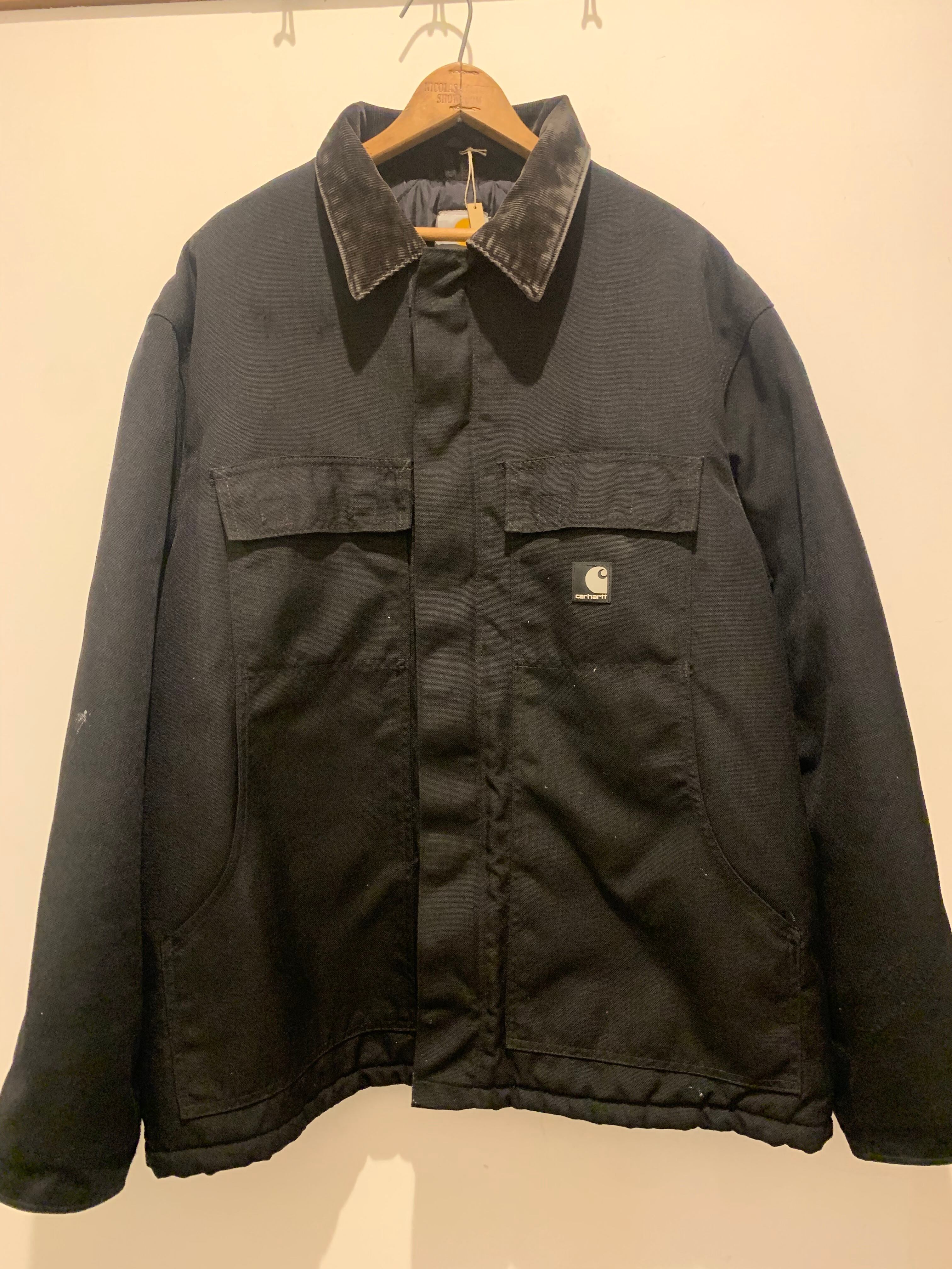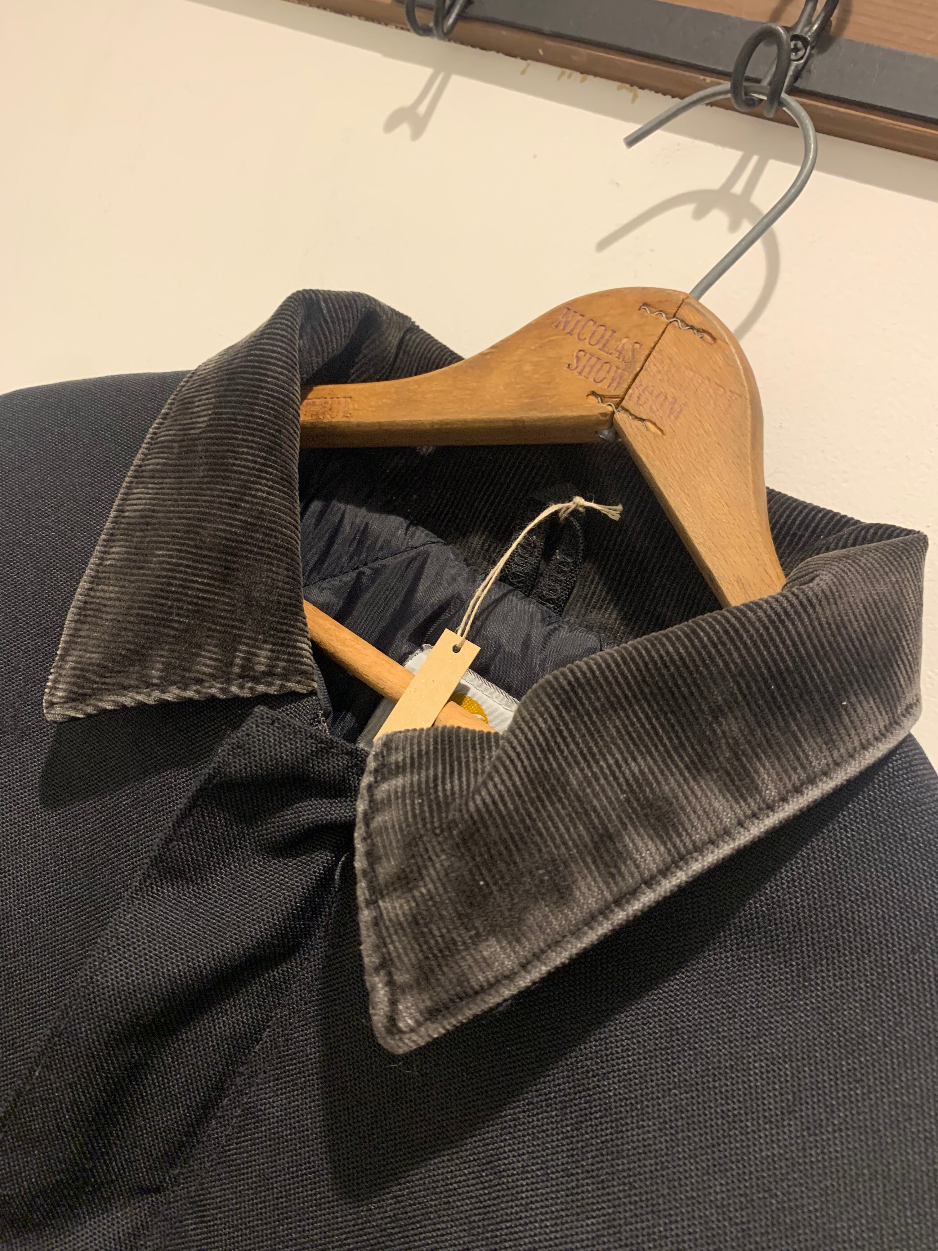 カーハートのブラックジャケットです。タグが珍しいブラックカラーで襟のコーデュロイ、ステッチも全てオールブラックとかっこいい1着です。内側もブランケットタイプが多いなかキルティング仕様になっていて着用しやすく嬉しいダブルジッパーになっています。あまり見かけないモデルでペンキなどの雰囲気も良くオススメです。