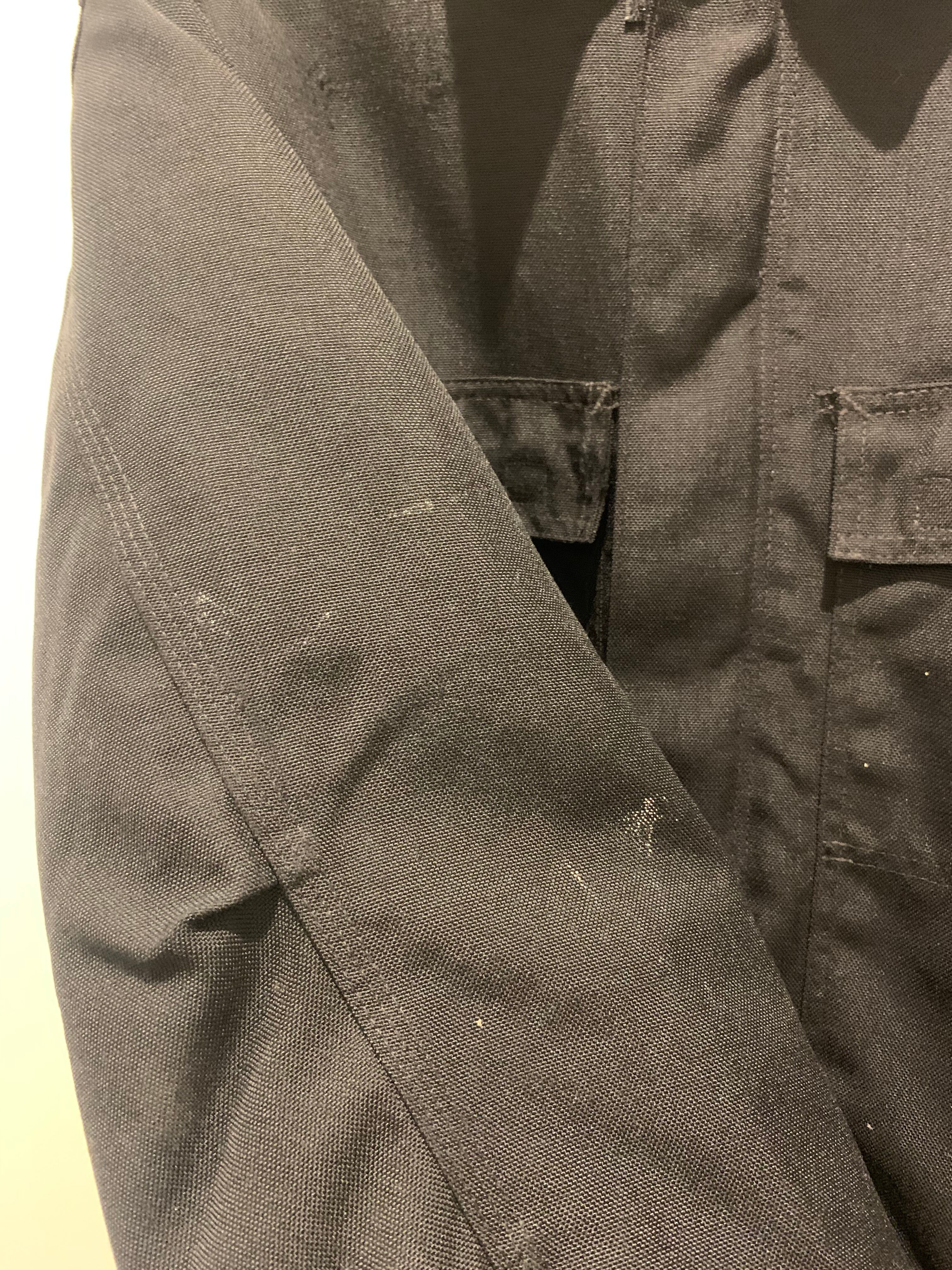 画像の様に、ペンキ汚れと襟のコーデュロイが少し薄くなっているところがございます。大きなダメージは無く着用には問題無いコンディションです。