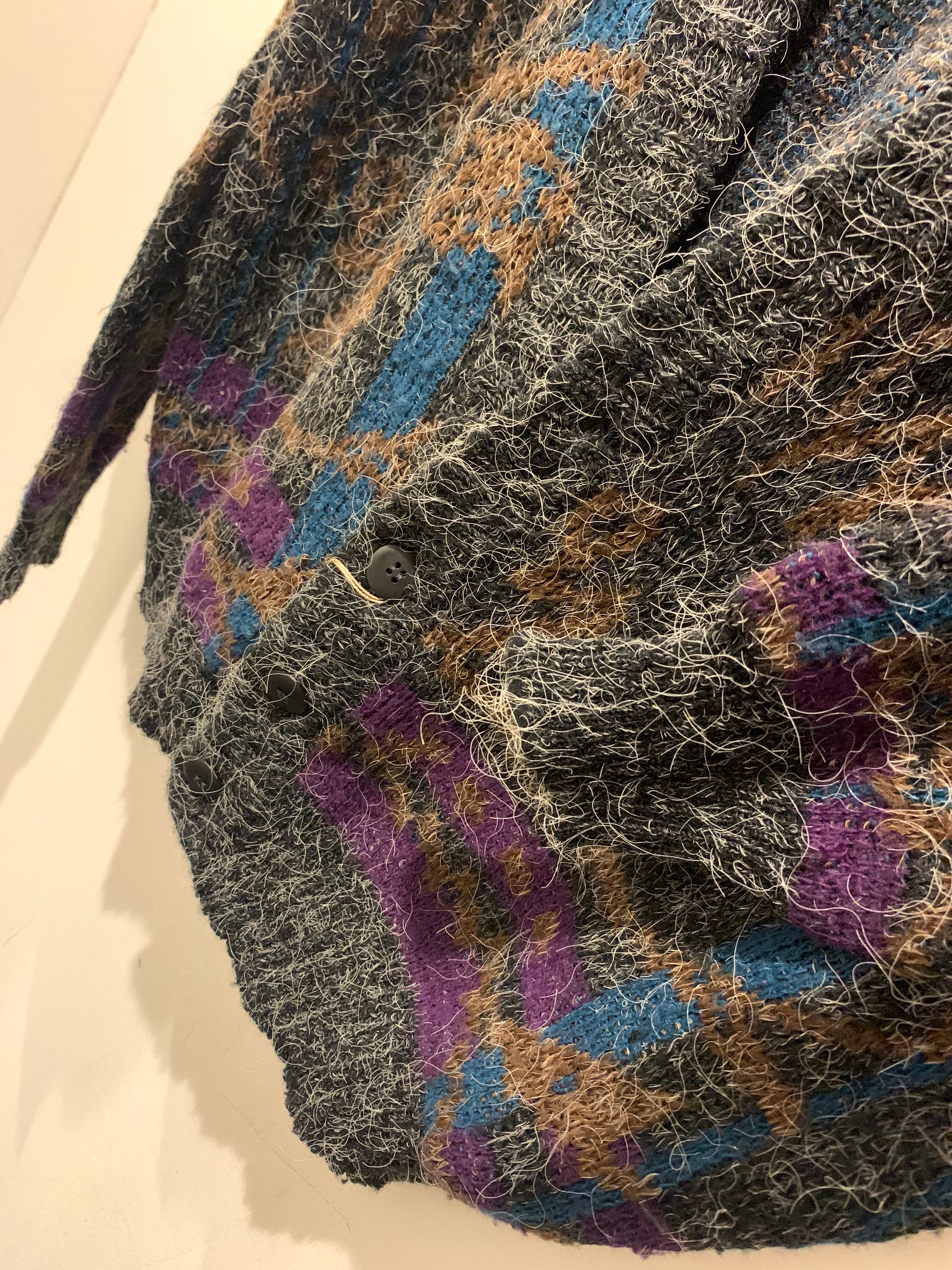 80年代アメリカ製のニットカーディガンです。ブラックベースにレオパードとチェックがミックスされたようなデザインがオシャレな1着です。毛足が長く雰囲気がモヘアニットに近いのもポイントですね。身幅もタップリな作りでしっかりアメリカ製とユニセックスでオススメなアイテムです。
