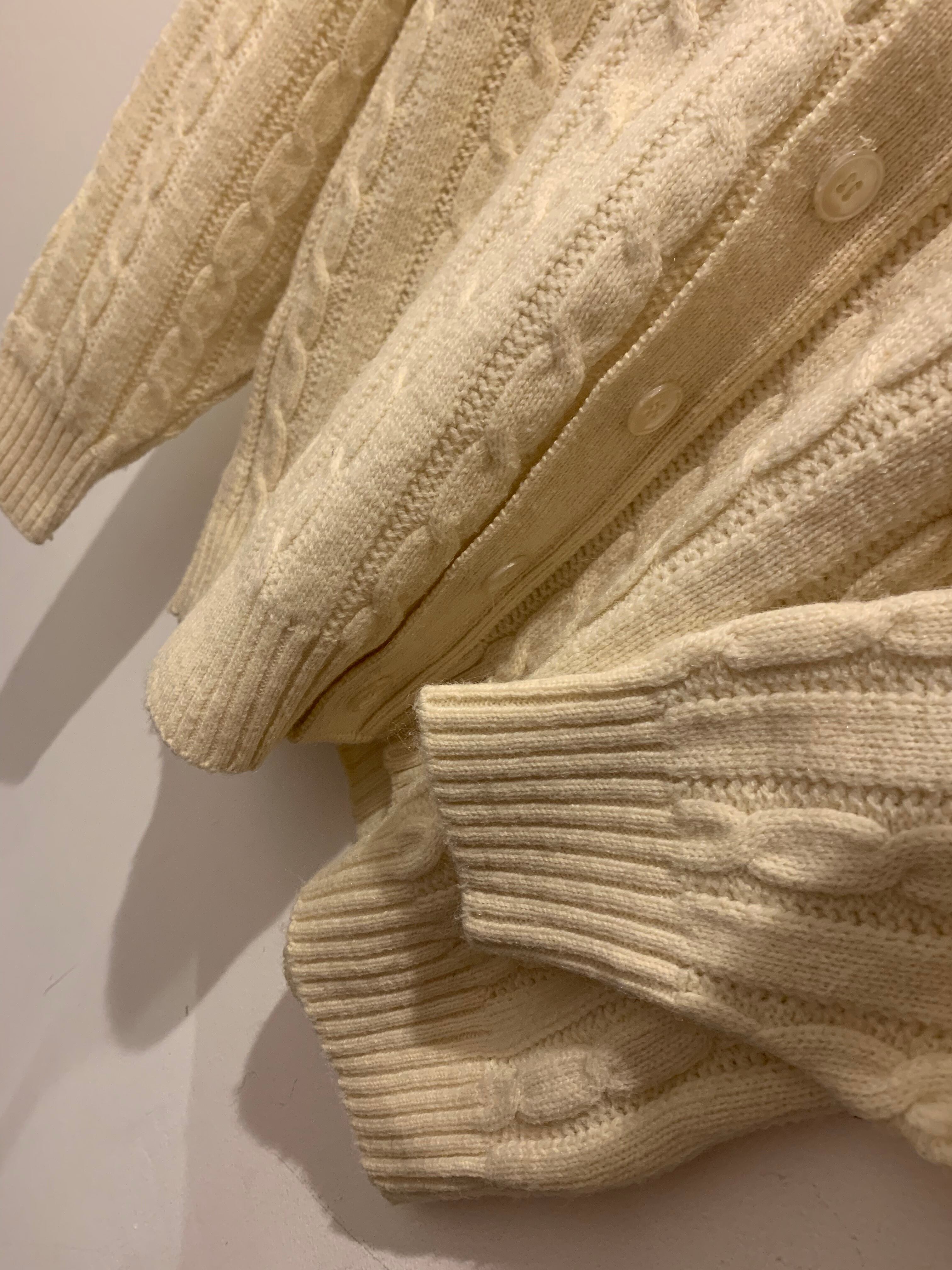 70年代アメリカ製ジャンセンのニットカーディガンです。オフホワイトカラーでケーブル編みのデザインとなります。ボタンも全て当時のオリジナルで揃っていてブランド自体もとても良いですね。白物はシミなどあったりするアイテムが多いのですが、こちらは綺麗なコンディションとユニセックスでオススメなアイテムです。