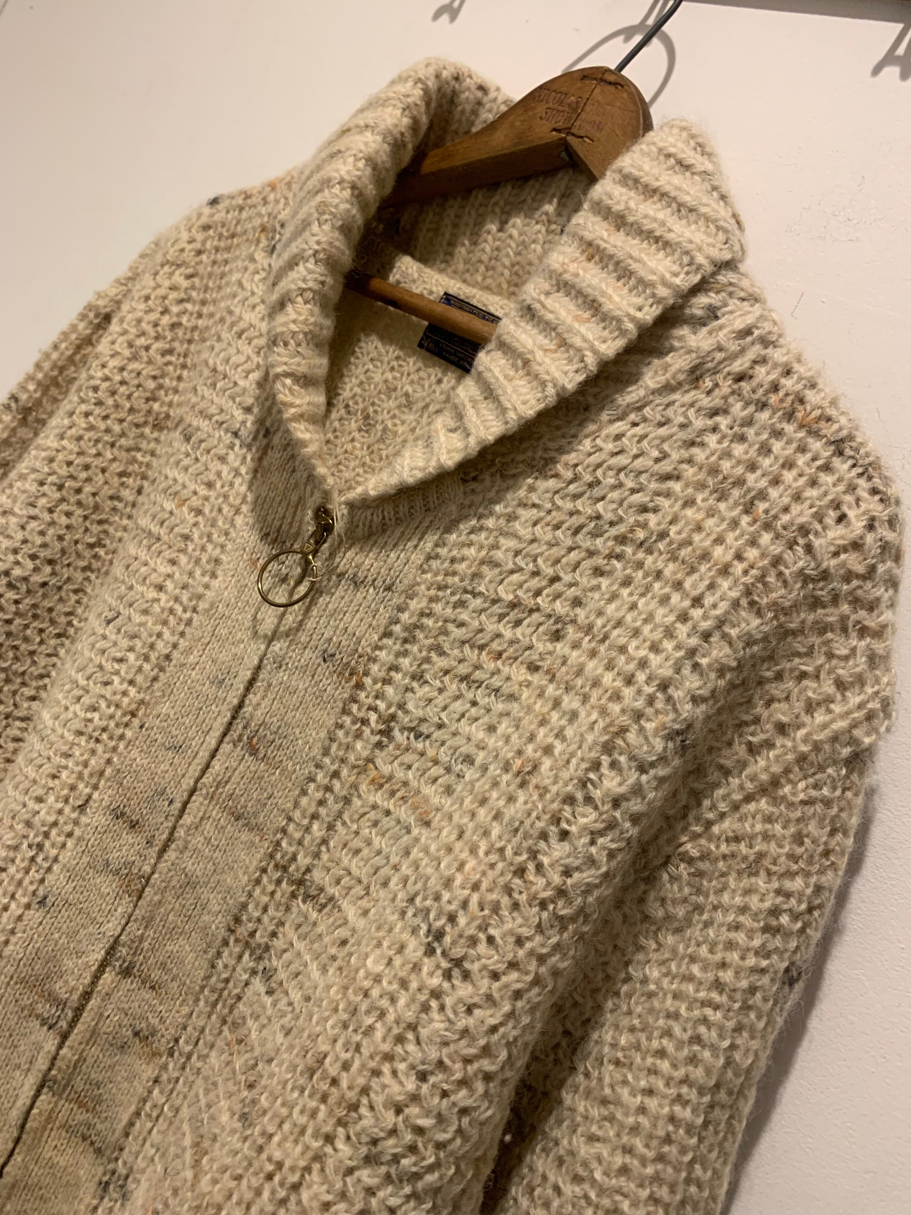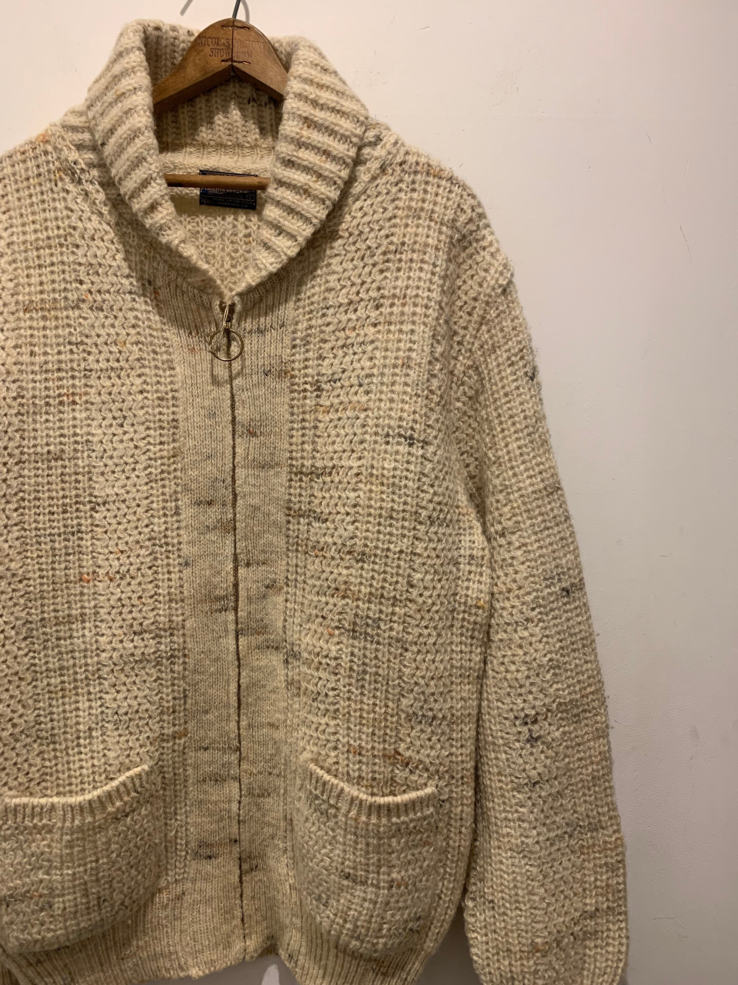 70年代アメリカ製ペンドルトンのジップアップニットです。アイボリカラーベースに少し他の色の糸がミックスしていて面白い色味となっています。ショールカラーにTALONのリングジッパーなど良いディテールですね。ペンドルトンといえばシャツのイメージがありますがニットアイテムもクオリティが高く良い感じです。縮みも無く綺麗なコンディションでオススメな1点です。