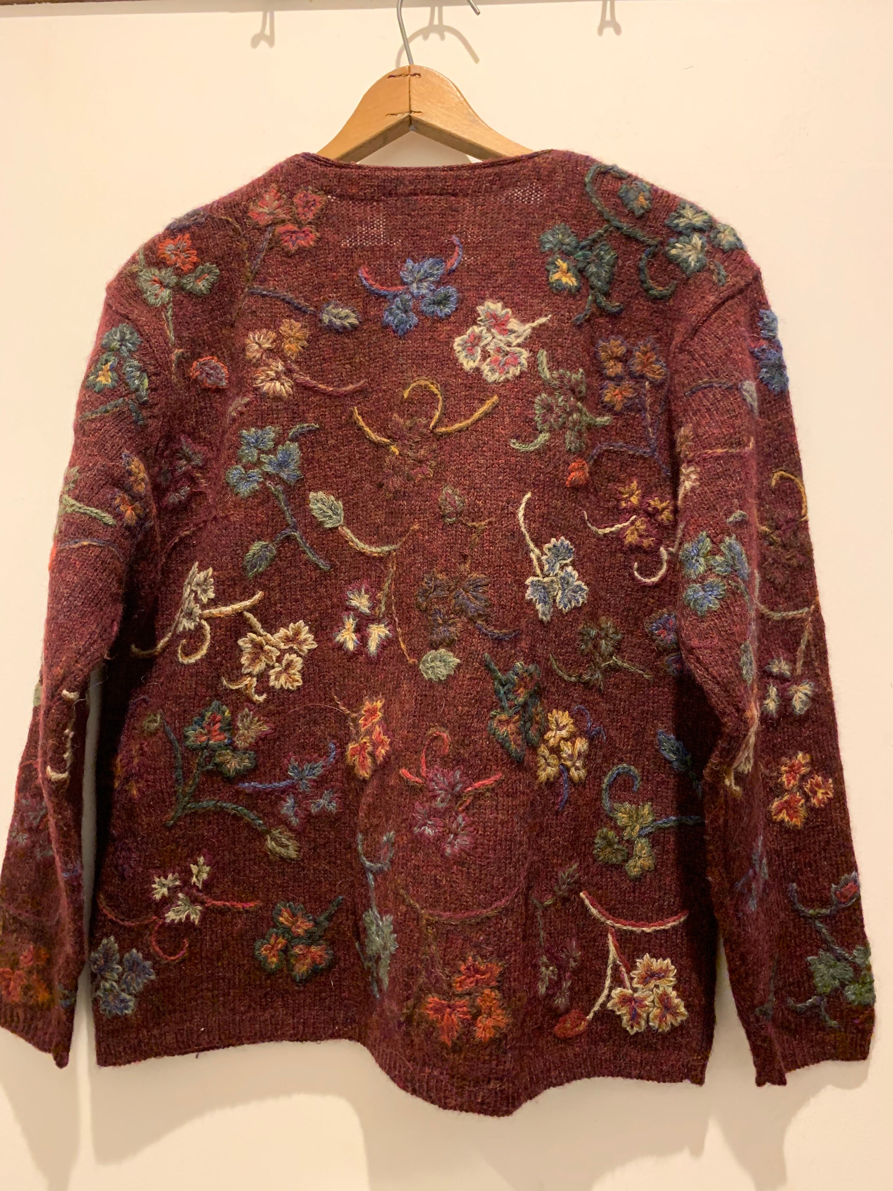 レディースタルボットのデザインカーディガンです。深みのあるエンジのミックスカラーに1つ1つ刺繍になっている押し花のようなとても良いデザインです。ボタンも光具合で色味が変化するマーブルボタンがアクセントになっていますね。丸首のカーディガンタイプでメインとしてもアウターのインナーとしても使えてオススメです。