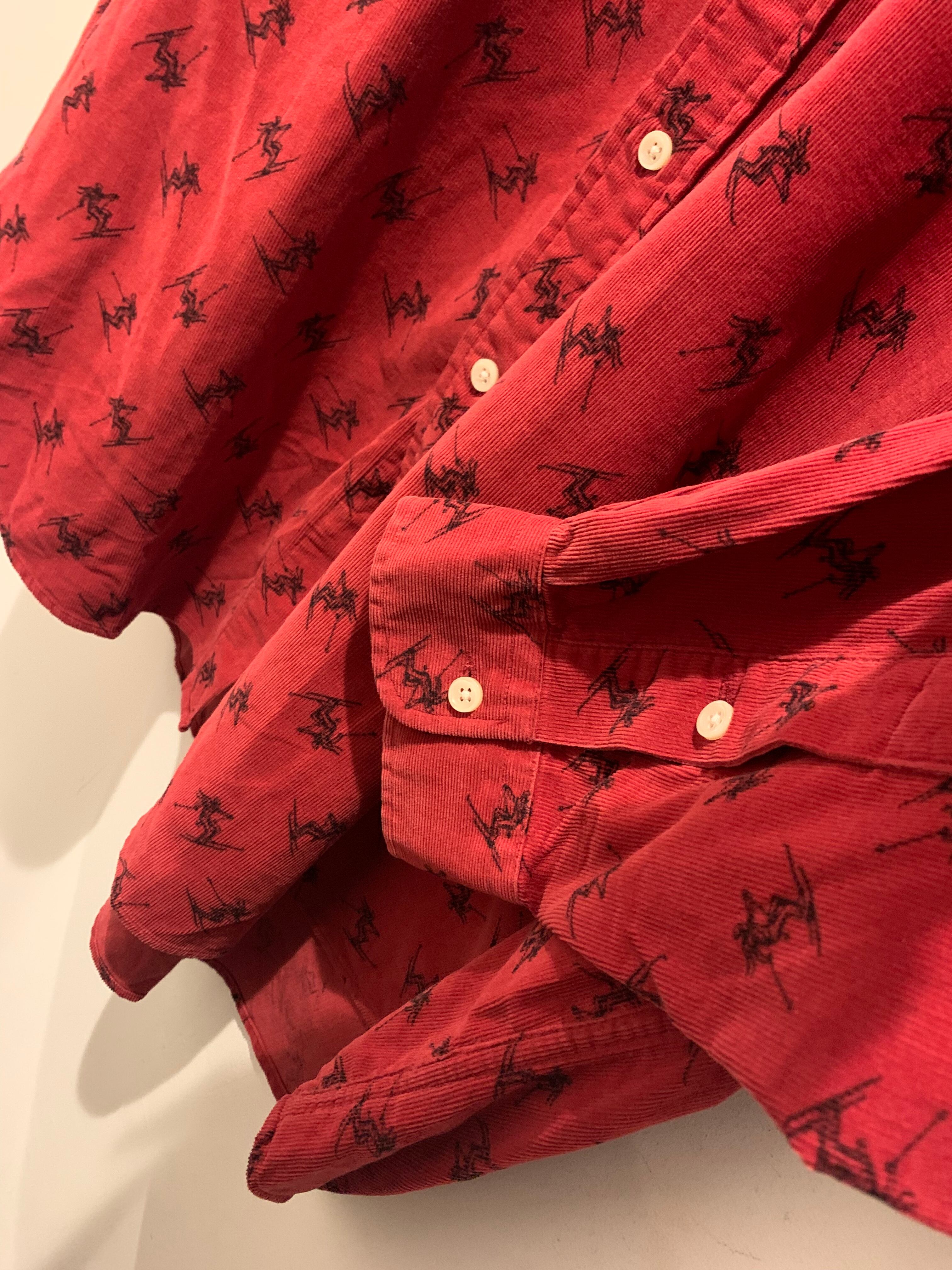 90年代ラルフローレンのコーデュロイシャツです。深みのあるレッドカラーベースにスキーをしている人のプリントが全体的に入っています。ラルフシャツといえばポニーマークのワンポイントやチェック柄が多い印象なのでこのデザインはあまり見かけず人と被らなそうですね。ポケットの柄合わせもしっかりしていてラルフの作りの良さを感じ取れます。コンディションも良く大きめなサイズ感でユニセックスでオススメです。