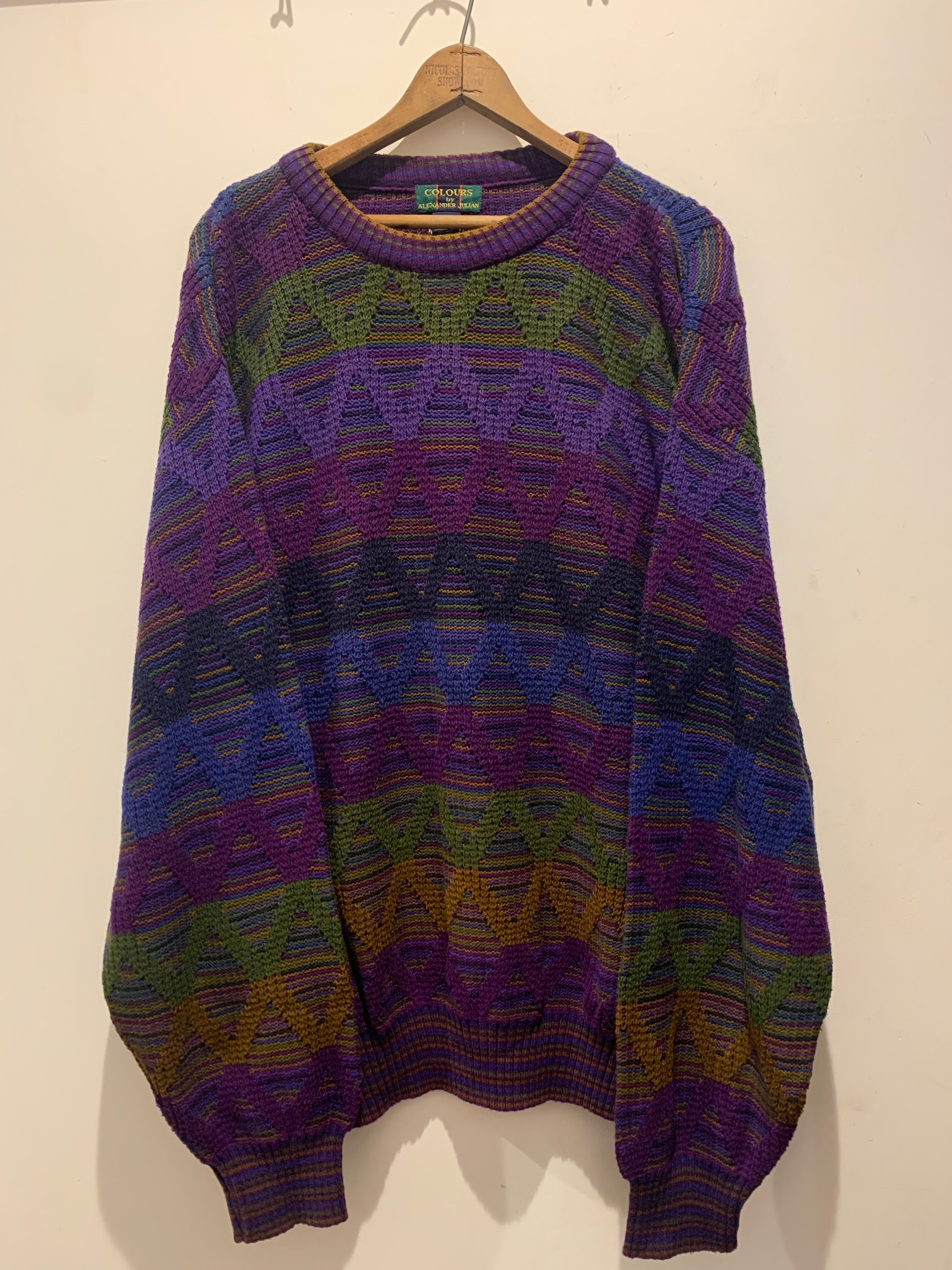 90年代アメリカ製のデザインコットンニットです。パープルカラーベースにボーダー柄とアーガイル柄が組み合わさった様なデザインがオシャレな1着です。良く見るとアーガイルの方が立体的で3D仕様になっているのもポイントです。コットンニットなのでチクチクが苦手な方も着用しやすくお洗濯も気軽に出来るのが良いですね。ゆったりめなサイズ感でユニセックスでオススメです。