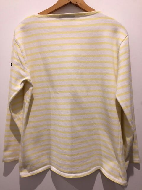 カラーはレモンイエロー×ホワイトです。ピカソも愛用していたセントジェームスです。ネイビーベースが多い中でこの配色は珍しいですね。これからの季節に良いカラーです。淡いデニムやホワイトパンツとも相性良いですね。