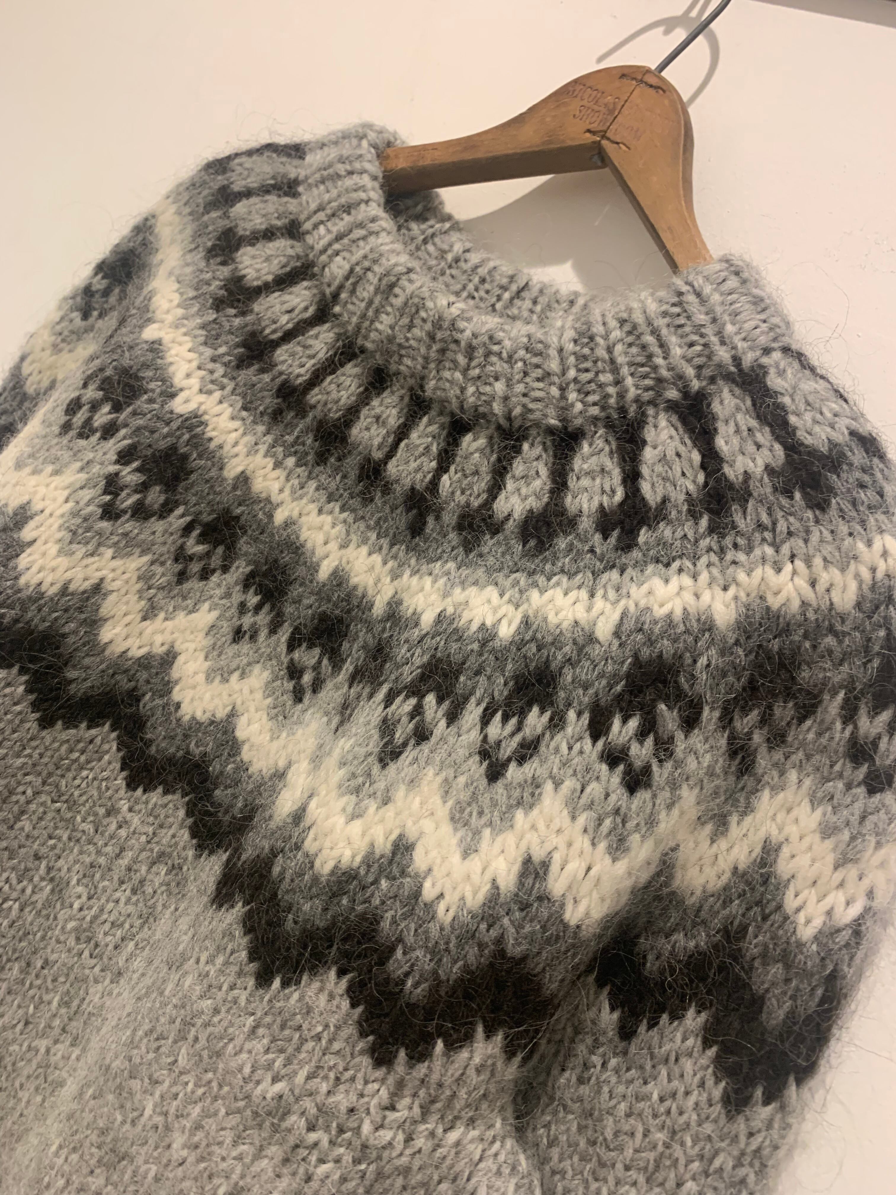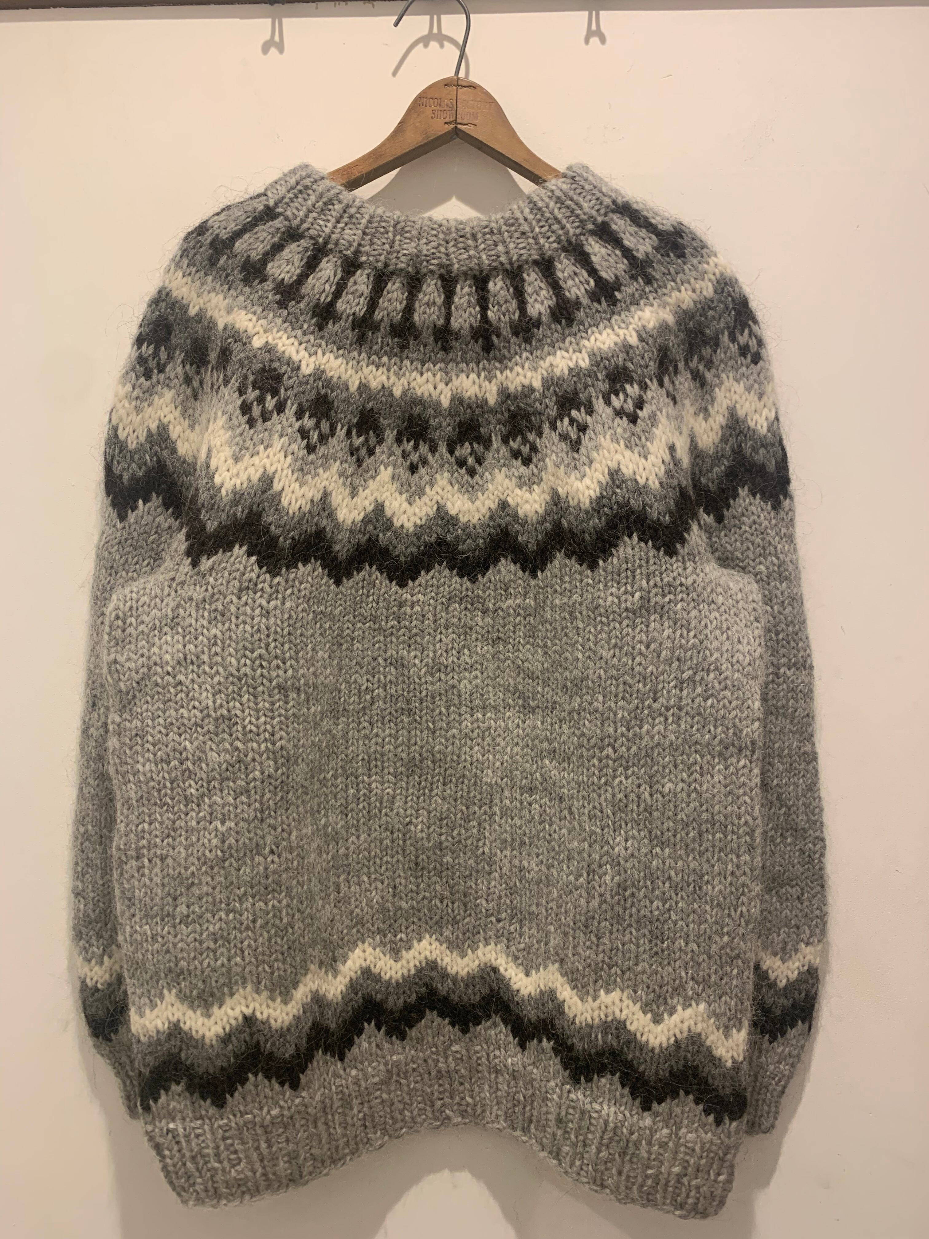 アイスランド製ハンドメイドのノルディックニットです。グレーベースのノルディック柄で質の高い1着となります。ハンドメイドで編まれていて新品ブランドだと相当高価なアイテムとなりますね。Usedでも小さめなサイズ感が多い中、こちらはメンズも着用可能な大きめなサイズ感でコンディションも良くオススメです。