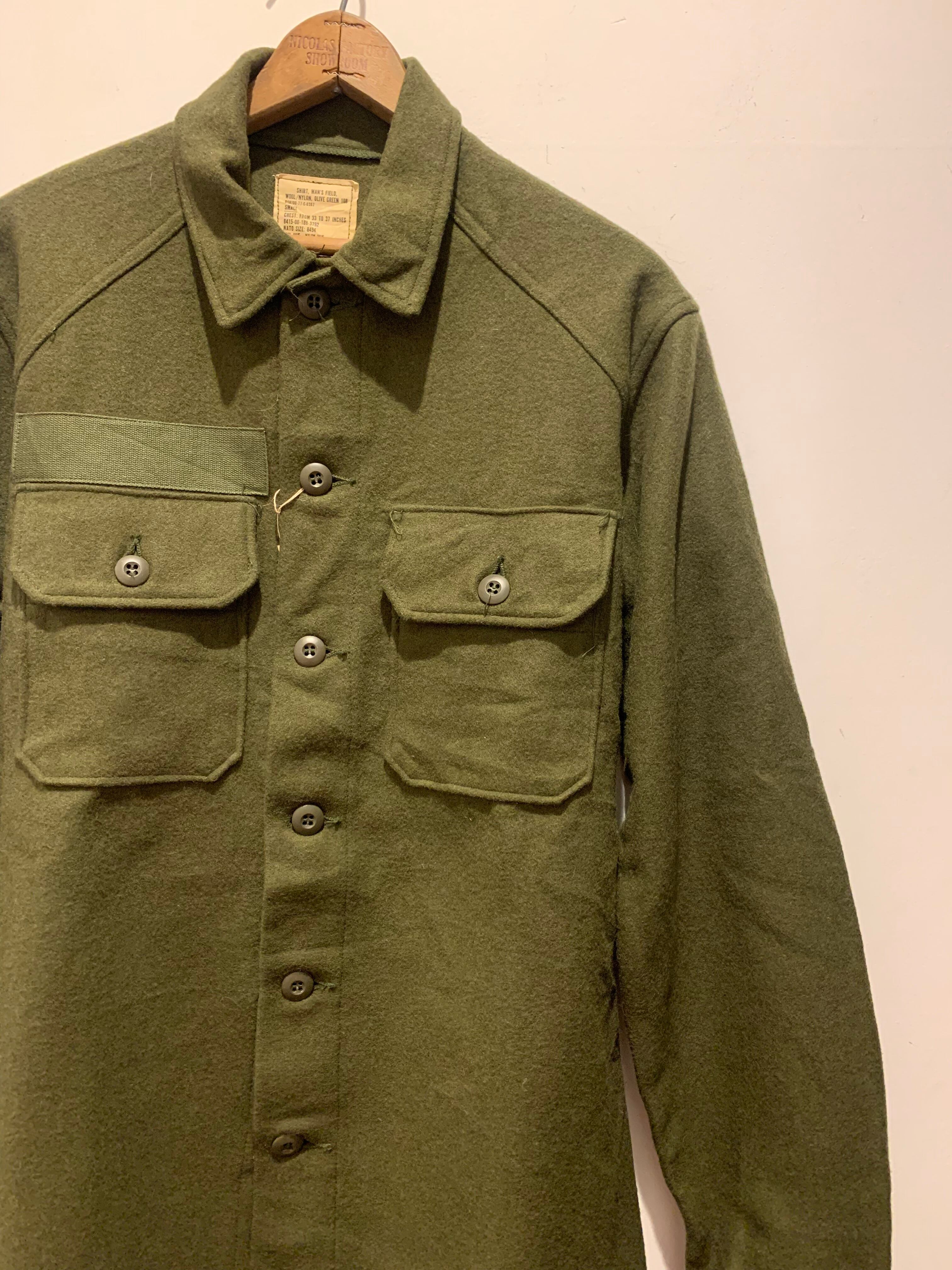70年代アメリカ軍のウールシャツです。1977年の官給品でオリーブグリーンカラーとなります。ウール×ナイロン素材なので生地感はしっかりしつつ柔らかさもあります。デッドストックに近いコンディションでワンウォッシュ程度の綺麗な状態でワッペンなど付く前の物でシンプルなデザインが良いですね。自分でバッチやワッペンを付けてアレンジするのも面白いと思います。Sサイズなので女性の方が少しゆったりめに着用していただくのもオススメです。