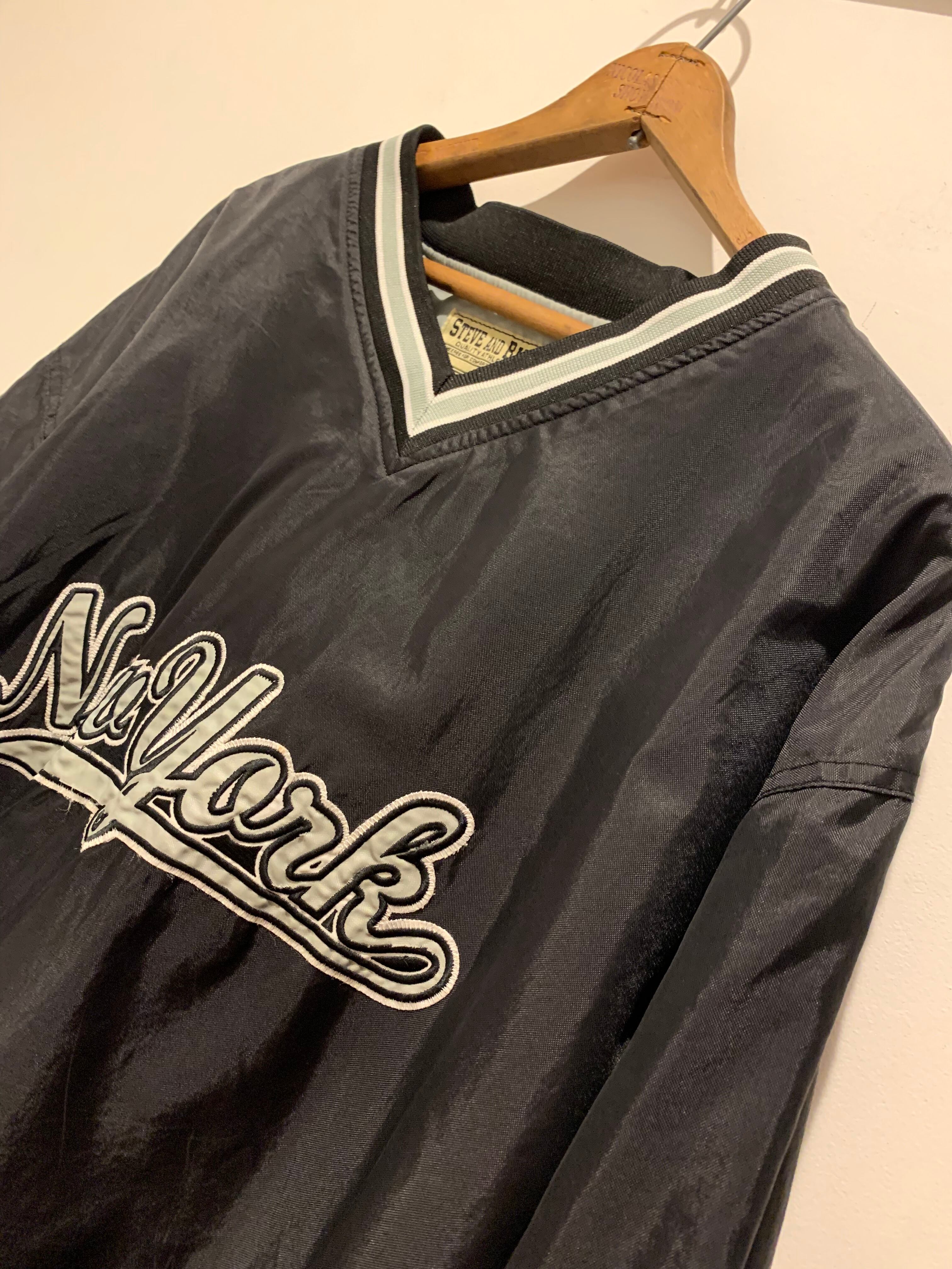 スティーブアンドバリーズのプルオーバージャケットです。1985年にアメリカで設立したブランドSTEVE AND BARRY'S。こちらは2000年代のアイテムでブラックカラーにNEW YORKのロゴがかっこいい1着です。裏地はスウェット素材になっていて袖のラインもアクセントになっていますね。大きめな作りなのでインナーにパーカーなど組み合わせても相性よくオススメです。