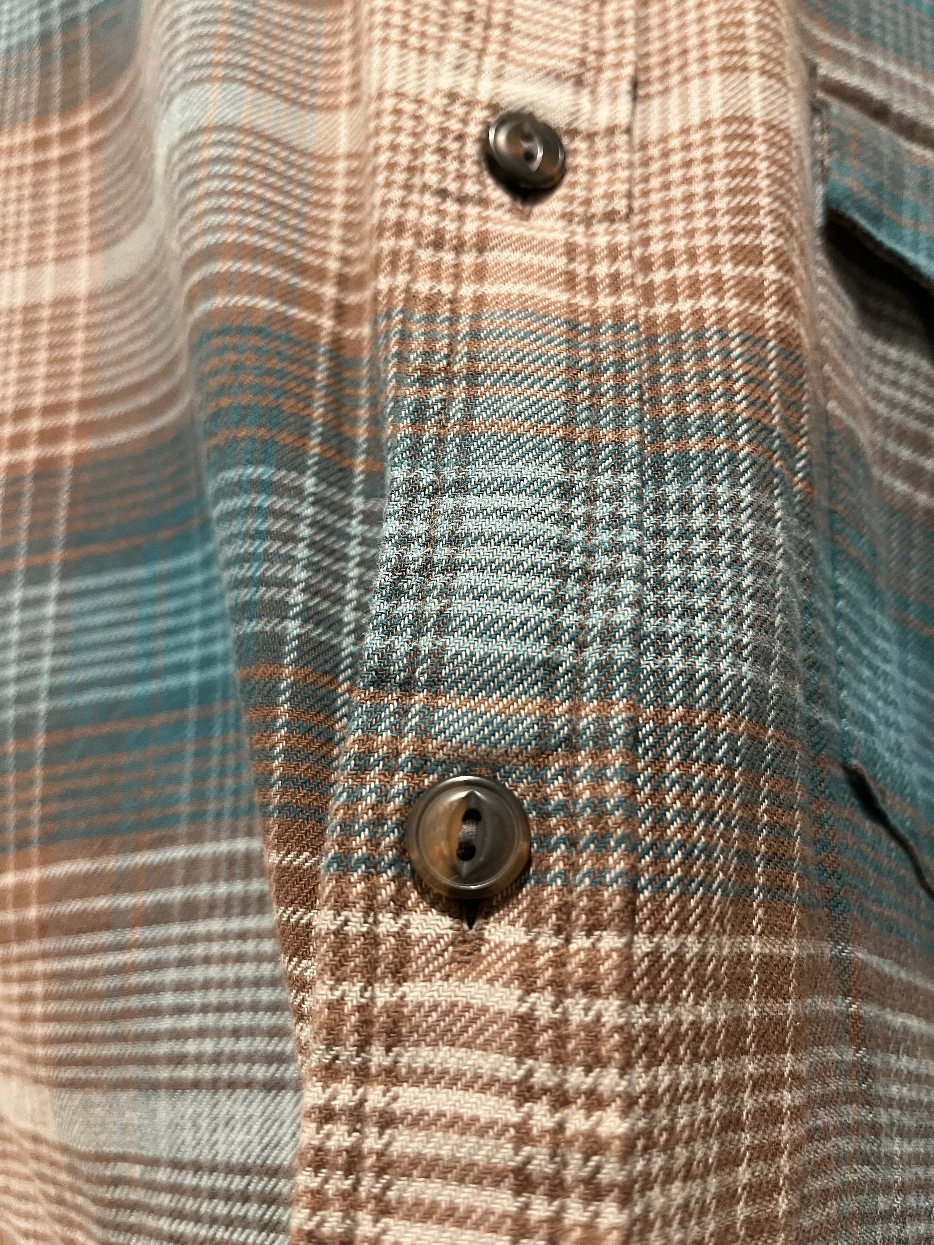 パタゴニアのオーガニックコットンシャツです。ブルーグリーン×ブラウンの配色であまり無いカラーリングです。猫目ボタン仕様で片ポケのフラップ付きで何より大きめなサイズ感のネルシャツが少ない中、ゆったり目で着用できるサイズ感がまた良いですね。2019年製と近年物ですがオススメな1点です。