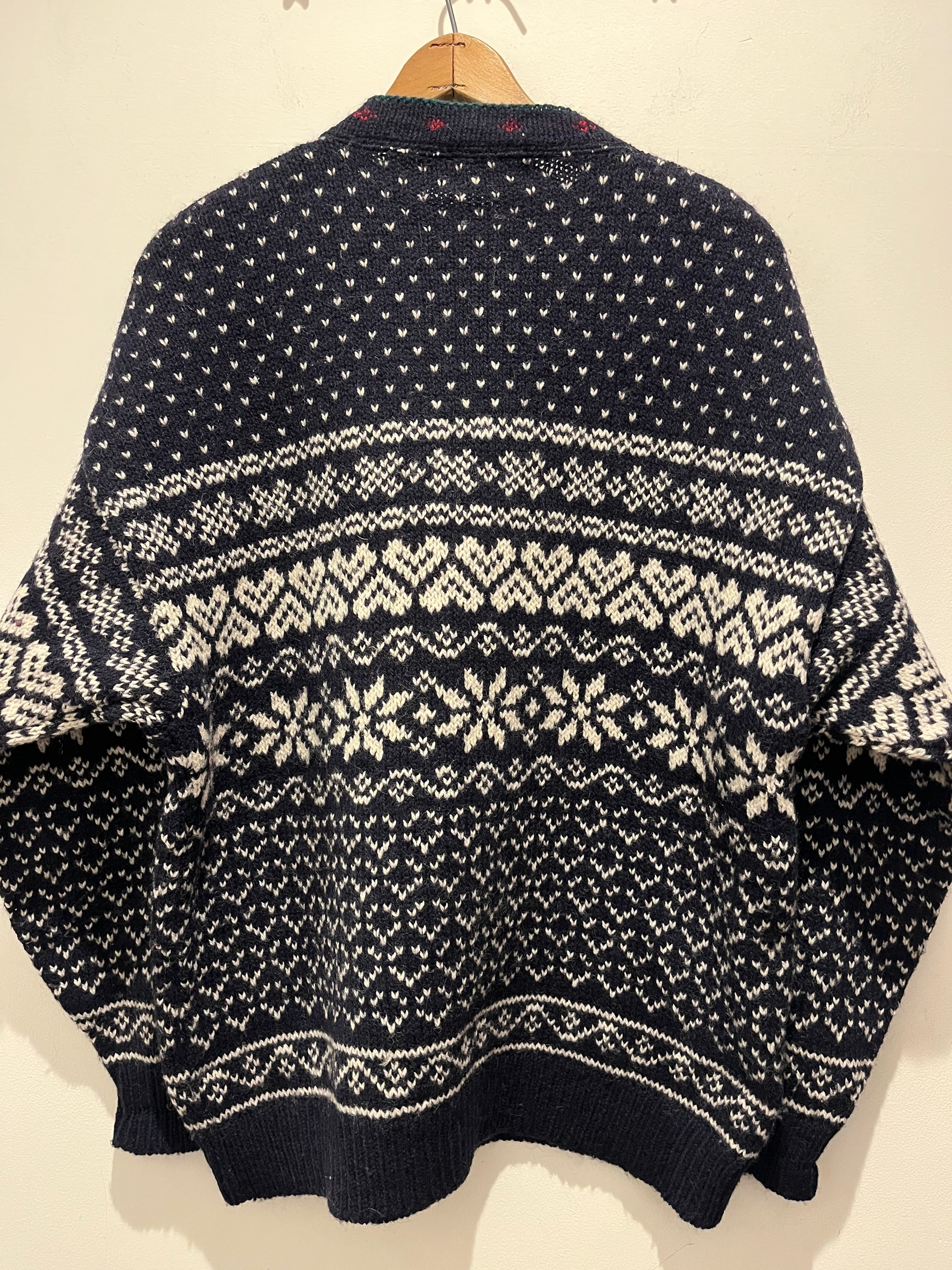 70年代アメリカ製L.L.ビーンのノルディックカーディガンです。ネイビーベースのカラーリングでレディース物となります。レディース物ですが珍しく大きめな作りでボタン合わせが気にならなければメンズでも着用できるサイズ感となります。丸首のカーディガンタイプでメインとしてもアウターのインナーとしても使えますね。バーズアイの様な雰囲気もあり、ボタンのデザインもオシャレでオススメな1点です。