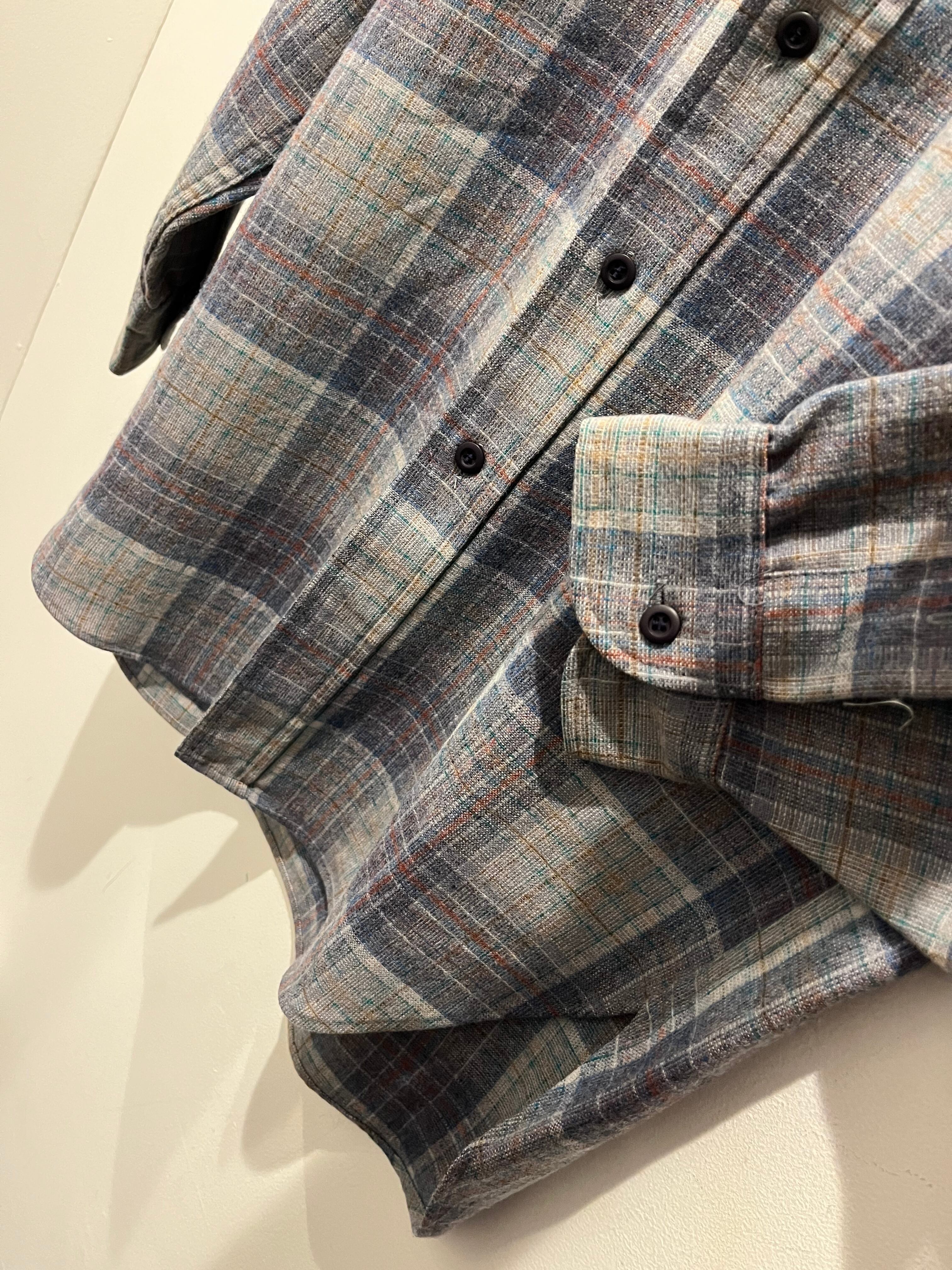 70年代アメリカ製ペンドルトンのウールシャツです。ブルー×グレーベースのオンブレチェックの様なカラーリングがとても良い1着です。フラップ付きのポケットや比翼裏にナイロン生地を使用したりと細かいところを見ても丁寧な作りが魅力的ですね。OLDペンドルトンは縮みや穴があったりするのも多いのですが、こちらは縮みも無く形もきれいでデッドストックに近いコンディションとオススメです。