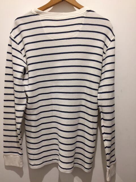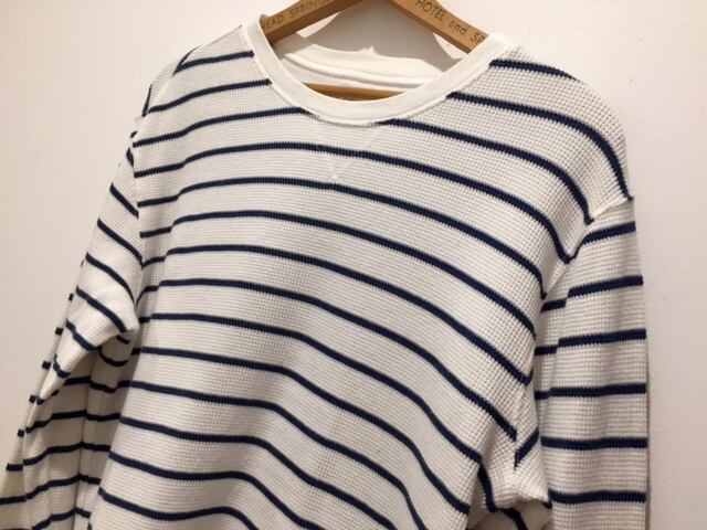 カラーはネイビー×ホワイトのマリンカラーです。年代は古いものでは無いですがUsedでなかなか良いのが見つからない100%コットンのサーマルです。ホワイトベースは特に綺麗な物は少ないですね。Tシャツとの重ね着や中にオックスフォードのシャツと組み合わせても使える1着です。縮みも無く形もキレイに残っています。
