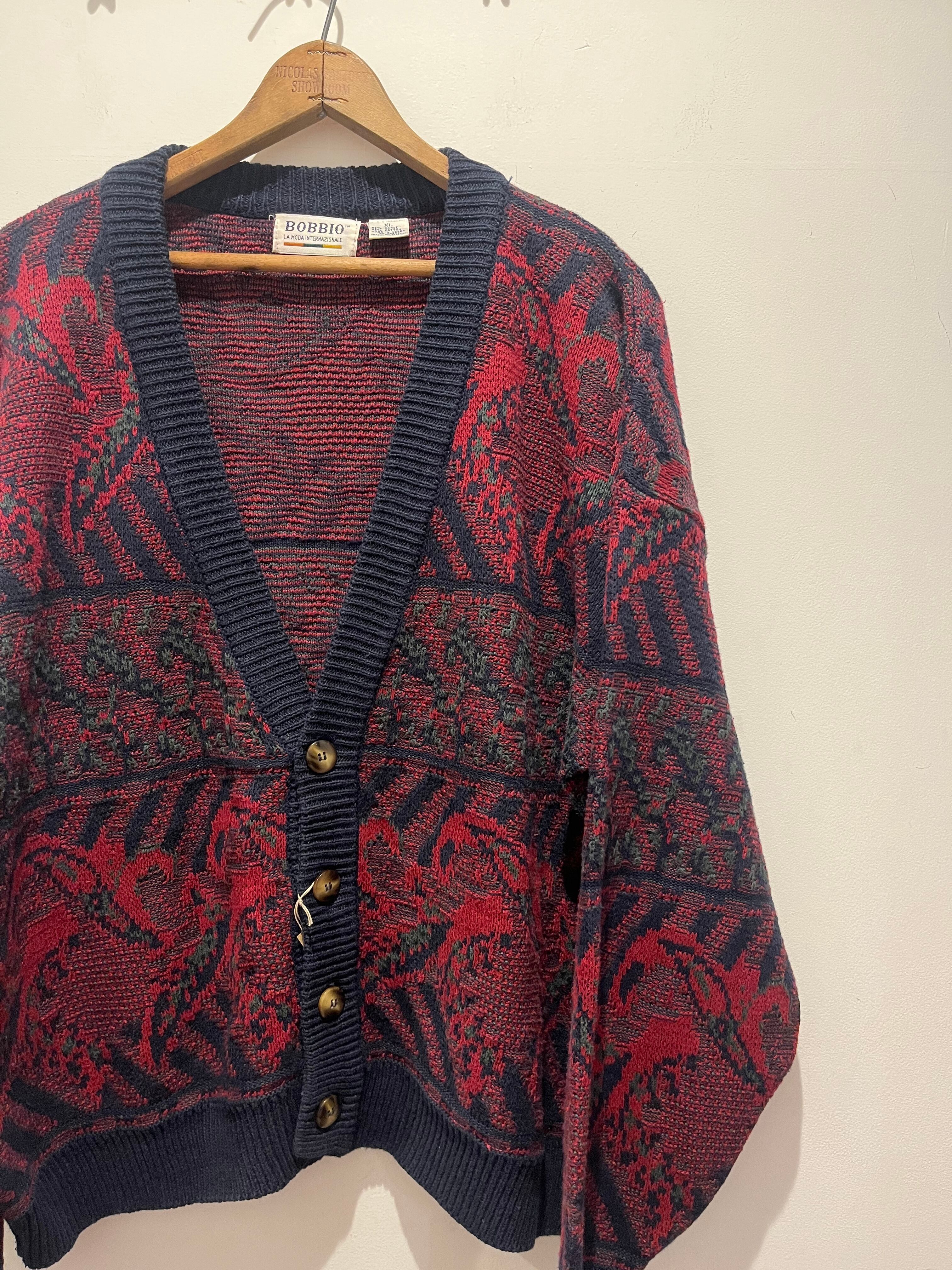 90年代のデザインコットンニットカーディガンです。総柄のデザインでよく見ると鳥のようなデザインになっていたりとお洒落な1着です。ボタンもマーブルボタンでコットン×リネンとチクチクが苦手な方も着用しやすいのがとても良いですね。身幅もタップリで着丈が短めの作りでコンディションも良くユニセックスでオススメです。