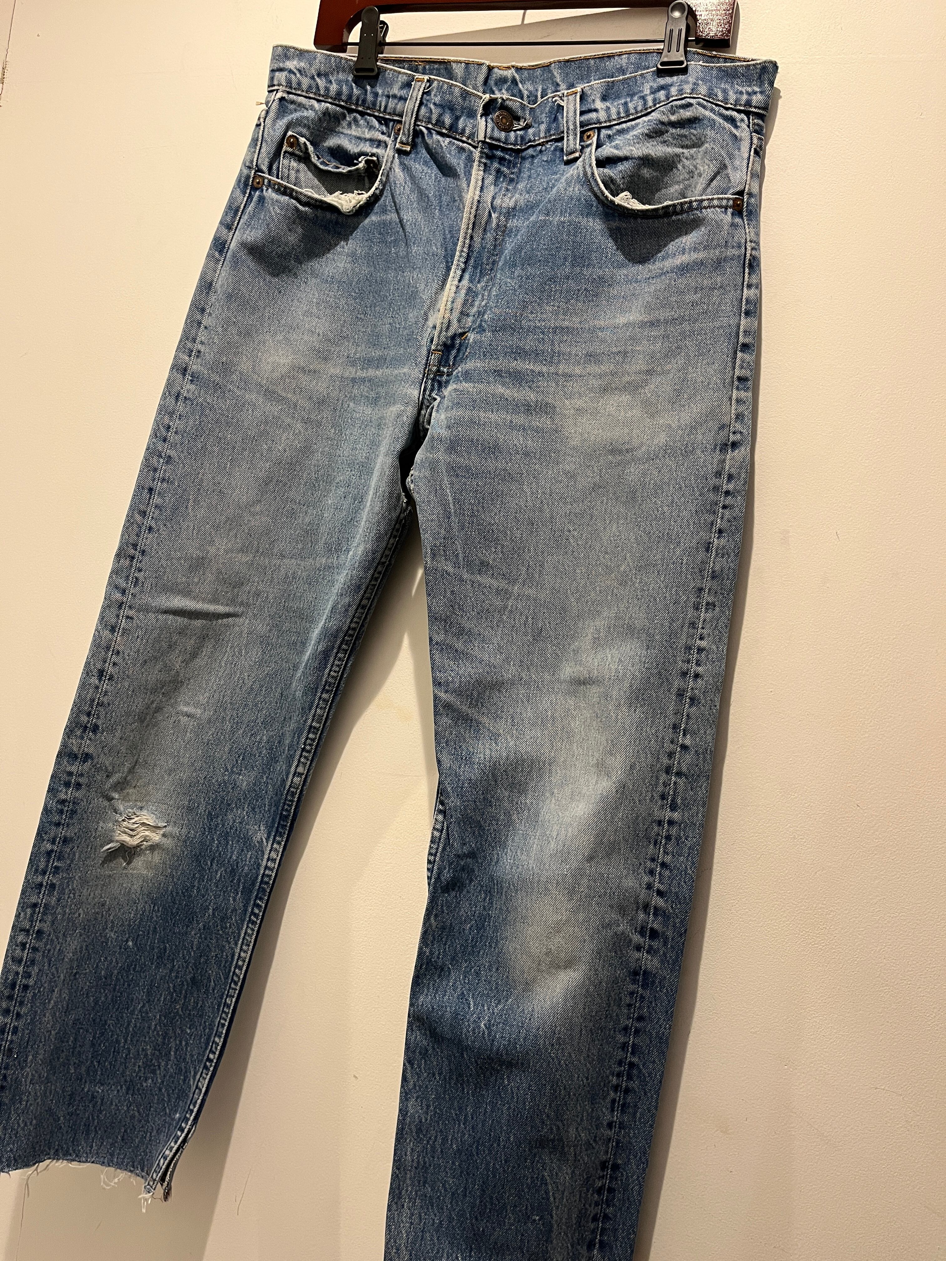 80年代アメリカ製リーバイス505です。ヒゲなども出ている綺麗な色落ちのデニムパンツです。505なのでジッパー仕様でリーバイスジッパーにトップボタン裏は650となります。パッチ表記がW35,L33ですが裾が切られていて短くなっているのと切れ目もあります。アメリカ製で雰囲気あるデニムも少なくなってきているのでオススメな1本です。