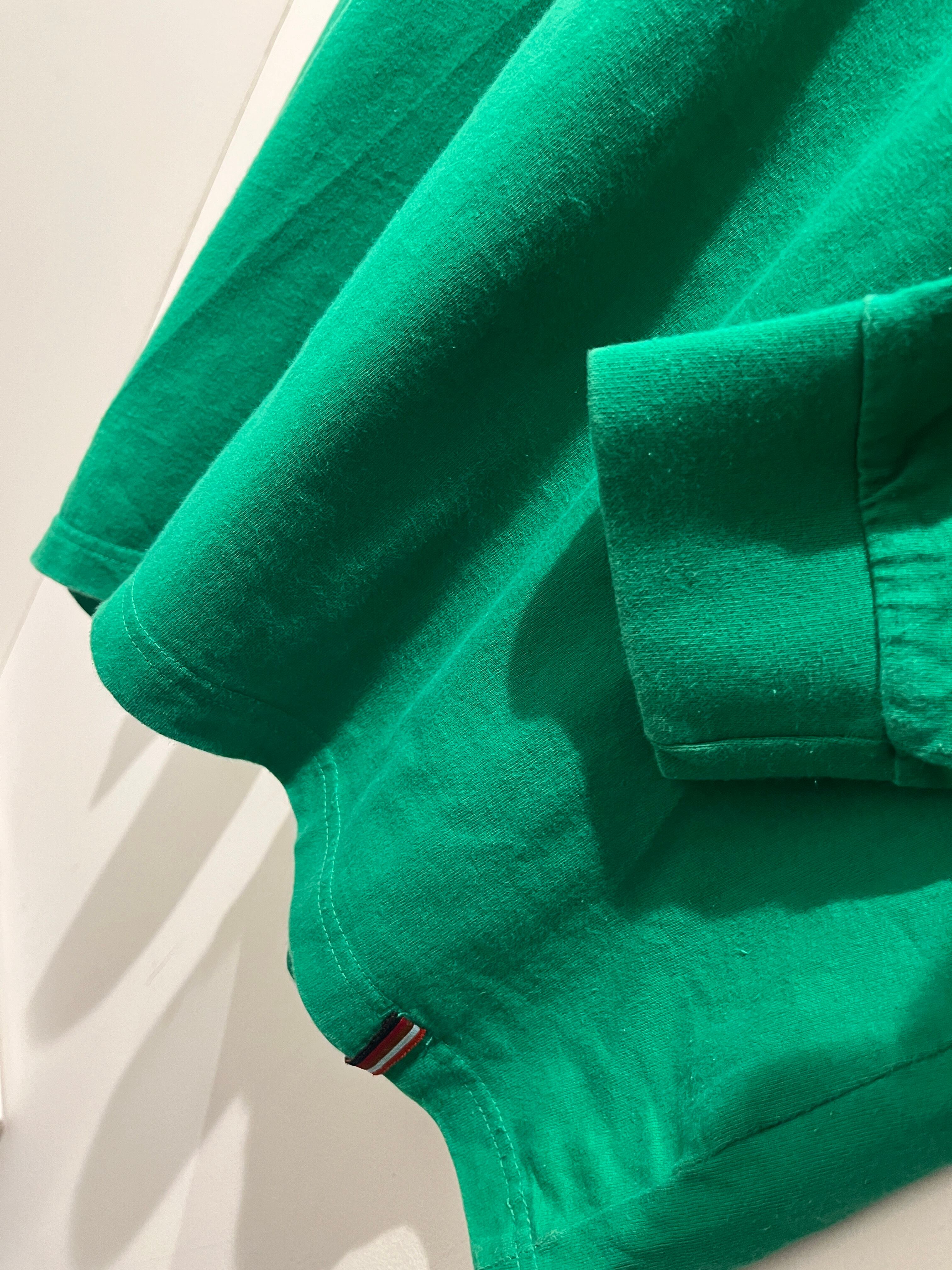 グリーンボディにフロントは2種類のライン、袖にもライン、バッグプリントと1枚で存在感あるアイテムとなっています。ゆったり目なサイズ感でユニセックスでオススメです。