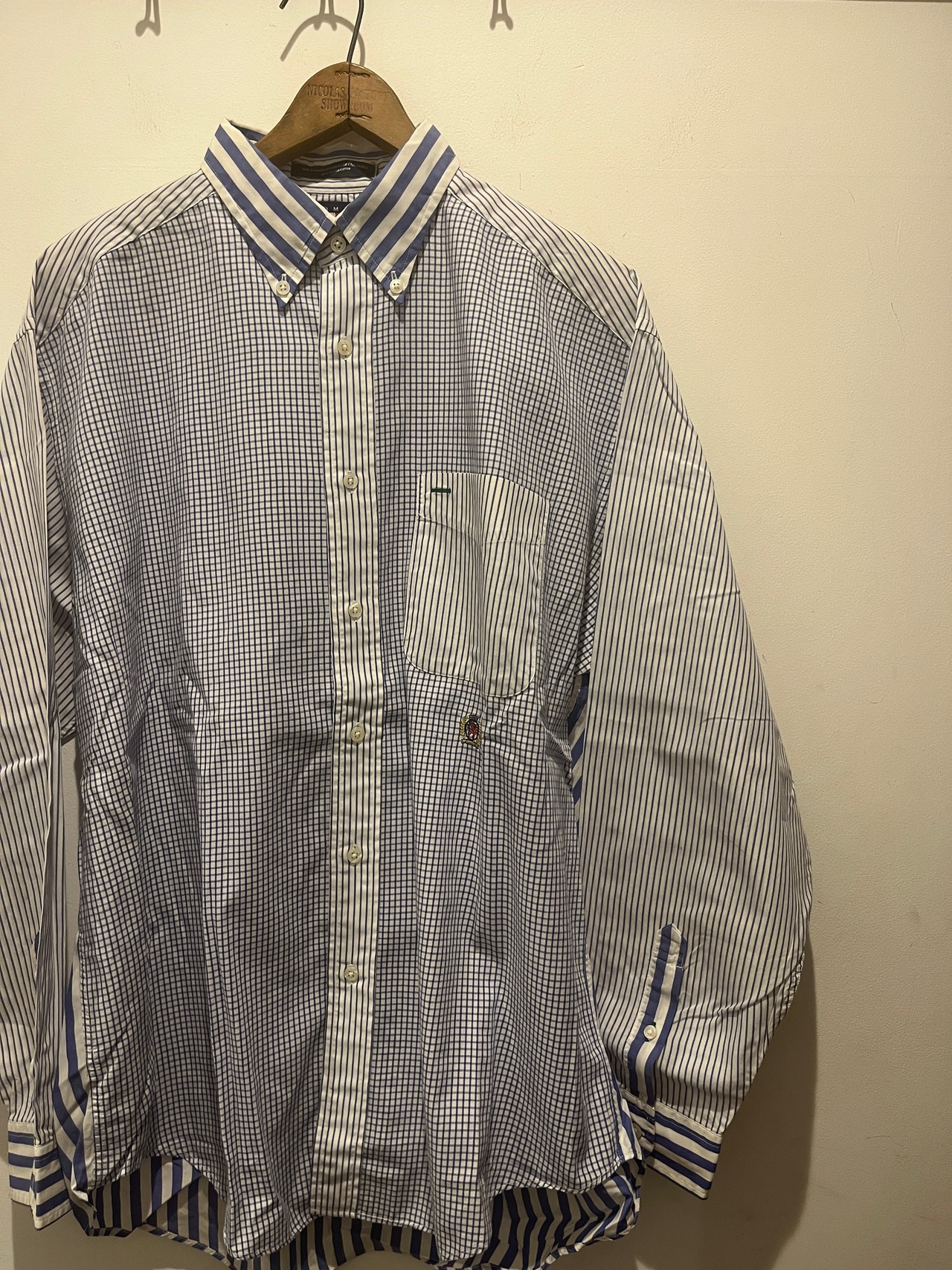90年代トミーヒルフィガーのデザインシャツです。ブルー×ホワイトの配色にストライプ×チェックのクレイジーパターンとお洒落なデザインです。グリーンのボタンホールや、ズレたワンポイント刺繍など細かいディテールも最高ですね。Mサイズ表記ですが90年代らしく大きめなサイズ感でコンディションも良くオススメな1点です。