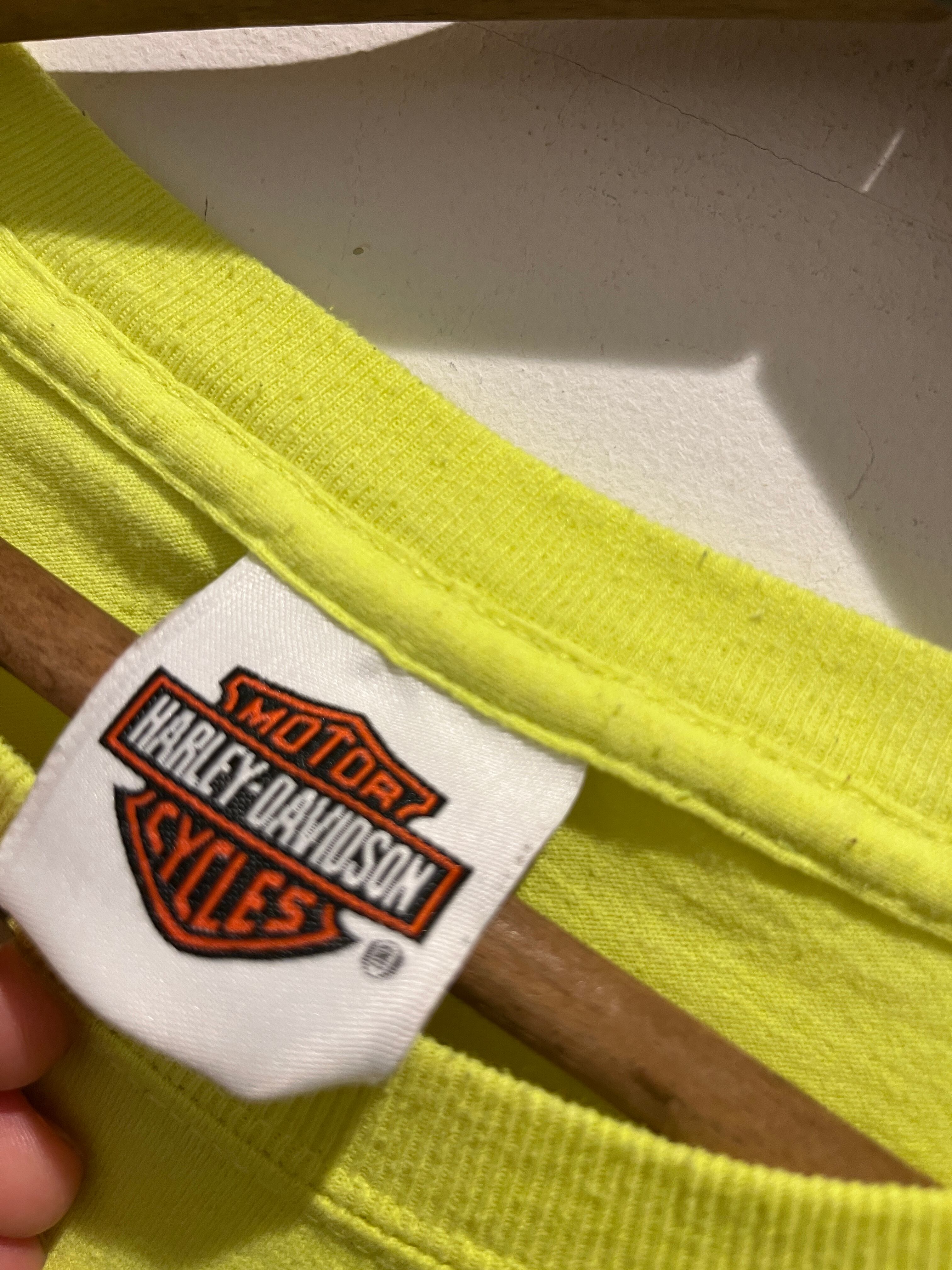 ハーレーダビッドソンのロングスリーブTシャツです。1903年にアメリカのウィスコンシン州ミルウォーキーで設立されたオートバイメーカー(HARLEY-DAVIDSON)通称ハーレーとしてとても有名ですね。こちらはそのハーレーのロングスリーブTシャツとなります。蛍光イエローボディでフロント+バッグ+袖にもプリントが入ります。2012年の物と近年物になりますが、ブラックカラーが多いなかこのカラーリングは珍しいですね。ユニセックスでオススメなアイテムです。