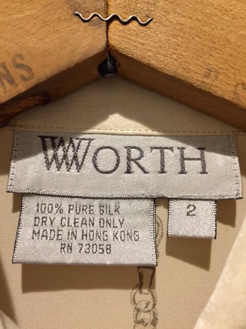 カラーはベージュです。シルク100%ということでとても滑らかな質感で当時も高価なアイテムだったと思われます。デザインもアンティークの懐中時計がフロント、バッグ、袖と豪華にデザインされてオシャレな1着です。インナーにしてチラミセでも良いですね。小柄な男性も着用出来るサイズ感です。